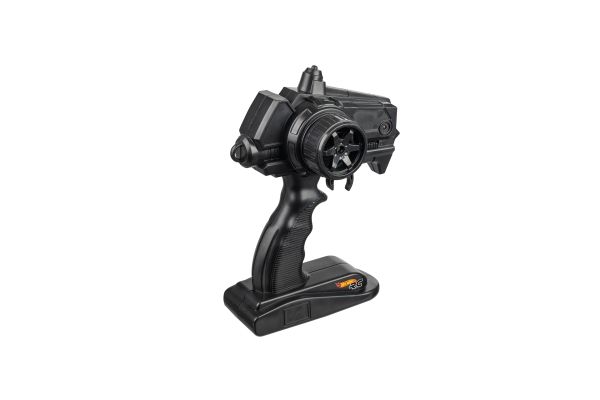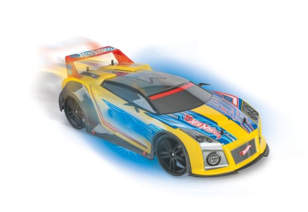 The super-fast RC Hot Wheels racing car accelerates up to 20 km/h! The race car features bright colours, cool back spoiler and LED lights on the bottom and sides. Scale 1:10. Package includes car, controller (2.4 GHz) and batteries (AA + 9V). 3+