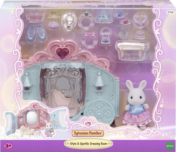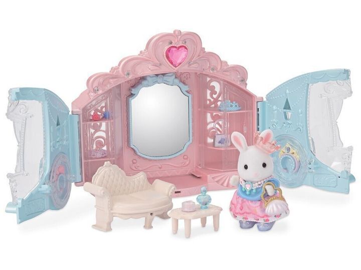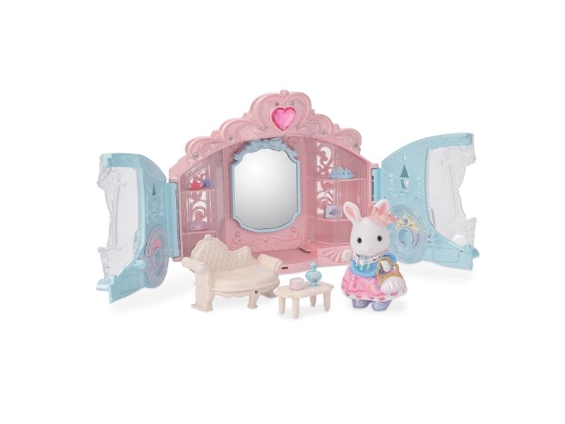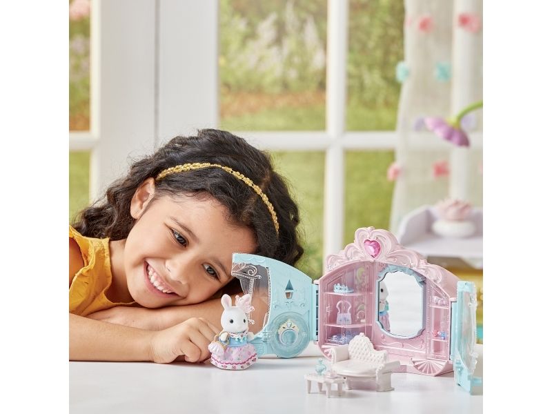The carriage doors open and it's transformed into a magnificent princess dressing room. Inside, the Snow Rabbit Girl can store all her accessories on the shelves: shoes, bags, jewellery and crowns. Thanks to the integrated handle, you can take your dressing room and your figurine wherever you want. The Snow Rabbit girl wears an exclusive princess dress. Figures head, arms and legs are movable. Clothes can dressed and undressed. Suitable for ages 3+. The Snow Rabbit girl has a dressing room, sofa, coffee table, 2 crowns, 2 handbags, 2 headbands, jewellery and a pair of shoes