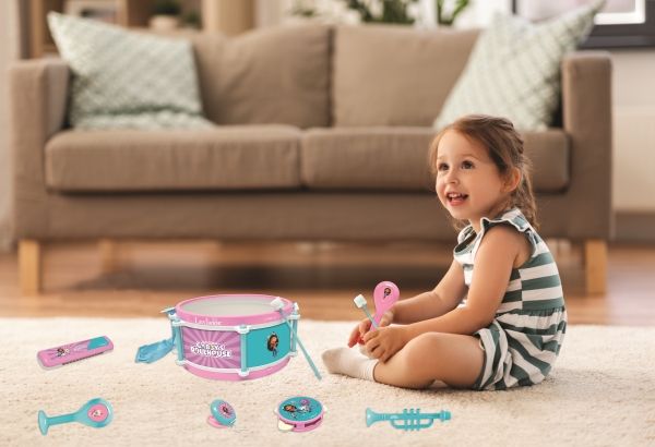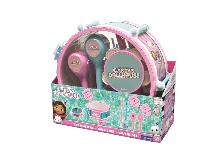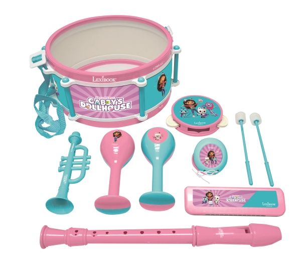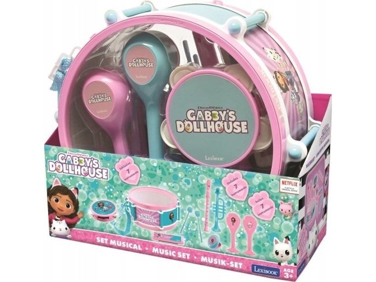 Gabby's Dollhouse musical set with 7 different instruments in 1 Now you can make your very own orchestra and learn how to play on no less than 7 different instruments. And you can easily take the whole orchestra with you on tour, for all the instruments fit into the big drum, which also acts as a bag. •1 pair of maracas to shake for rhythm fun! •1 castanet with 2 cute pictures! •1 harmonica, 1 recorder and 1 trumpet •1 small tambourine to follow the beat of the music! •1 pair of stick included * Product size: 28,3*12,2*25,5cm