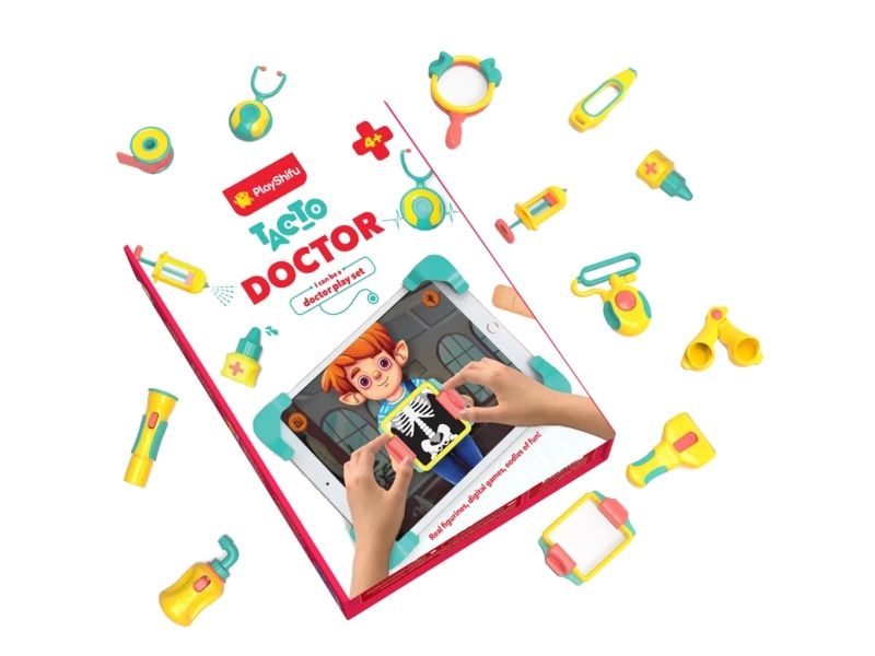 Indulge your child's curiosity with an immersive learning experience through the PlayShifu Shifu Tacto: Doctor. This innovative game set transforms your child's tablet into an interactive doctor's clinic simulator. Enhancing pretend play with story-based games and authentic STEM learning outcomes invites your young one to discover the exciting world of healthcare through hands-on digital exploration.Interactive doctor kit that brings medical play to lifeReal STEM learning tool (Science Technology Engineering Mathematics)Enhances pretend play with digital interactionStimulates cognitive development through gameplayFosters social-emotional intelligence in a healthcare settingNow available in Nordic languages: Swedish Danish and Norwegian!Interactive doctor kit for kids Shifu Tacto Doctor isn't just another toy?it's an interactive doctor's kit designed by leading educators to captivate your child with engaging story-driven games. This comprehensive set introduces your child to the fascinating world of healthcare and medical science in an immersive and interactive environment that blends physical pieces with digital play for balanced meaningful screen time. The 12 mini medical tool figurines magically spring into action when placed on your tablet screen letting your child experience being a real physician. Real STEM learning tool While it's playtime for kids it's valuable learning time too! Deeply rooted in STEM principles (Science Technology Engineering and Mathematics) this game set helps children explore scientific concepts through hands-on pretend play. It builds understanding of basic medical procedures health concepts and first-aid techniques transforming entertainment time into productive learning sessions that develop critical thinking skills. Enhances pretend play Thoughtfully designed to boost imagination this play set elevates pretend play to new heights. Whether checking a patient's temperature or analyzing X-rays each activity enhances your child's problem-solving abilities and builds knowledge through play. The best part? Each session introduces a new storyline keeping your child consistently engaged and excited to learn more. Stimulates cognitive development Perfectly crafted for children ages 4-8 the set features 3 interactive games with over 100 progressive levels that stimulate cognitive development. Designed by leading educators we're committed to making screen time meaningful by fostering independent learning and problem-solving skills in children through guided discovery. Fosters social-emotional intelligence Stepping into a doctor's role helps your child develop empathy understand emotions and respond appropriately?all critical aspects of social and emotional intelligence. By equipping them with foundational knowledge about medical procedures we aim to transform potentially stressful doctor visits into friendly informed experiences they can approach with confidence. Available in Nordic Languages! We're proud to offer full support in Swedish Danish and Norwegian as well as English making this educational tool accessible to children across the Nordic region in their native languages. Package includes The Tacto Doctor set contains four frames and 12 unique figurines including a stethoscope thermometer medicine bottle X-ray bandage flashlight magnifier scissors spray syringe BP pump and ultrasound?all designed to interact seamlessly with your tablet. Product specificationsCompatible with iPads 5 and above (iPad 1 & iPad Mini 1 2 and 3 not supported) iPad Air 2 and aboveAlso compatible with Android tablets: 7-inches and above minimum 3GB RAM (Samsung Tab A and S7+ not supported)All Android mobile phones are incompatibleCan be used with Fire HD 10 Fire HD 10 Plus (2021 & 2023) Fire HD 8 Fire HD 8 Plus (2020 & 2022)Dimensions: 235 × 300 × 45 mmWeight: 640 gWhat is STEM? STEM stands for Science Technology Engineering and Mathematics. It's an educational approach that integrates these four disciplines to provide practical real-world learning experiences. STEAM is an expanded version that includes Arts along with the STEM subjects.
