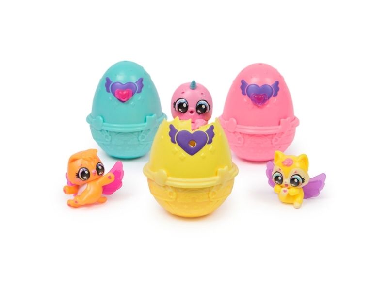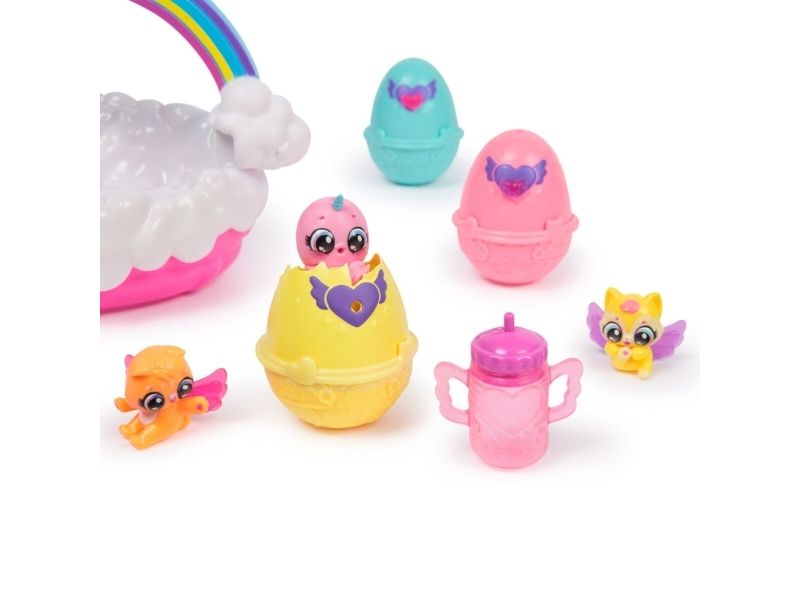 Celebrate spring with the Hatchimals Alive Neon Rainbow Spring Basket. With your love and care, super cute Hatchimals Alive characters come to life. These self-hatching eggs hatch like real eggs when activated by water. Inside the basket, discover 3 Hatchimals eggs, a bottle and a sweet Kittingale and Foxstritch out-of-egg. To start hatching, remove the 3 pacifiers from the eggs, fill the bottle with water and squeeze it into the eggs. In seconds, a Bunnypie, Puppadee and Narwing will start revealing themselves, cracking through the eggs. Display your characters inside the Easter basket or use your imagination to play out your own adventures. There’s a booster seat and pillow molded in the basket and the pacifiers fit into each figure’s mouth for nurturing play. Lift the rainbow handle and take your neon Hatchimals friends with you anywhere you go. Those who enjoy action figures, small toys, dolls, and doll house play will love Hatchimals surprise toys. A fun gift idea for the Easter egg hunt, birthday gifts for girls and boys, Easter egg fillers, holiday gifts. Hatch a basket of Neon Rainbow Hatchimals Alive characters with the Spring Basket.
