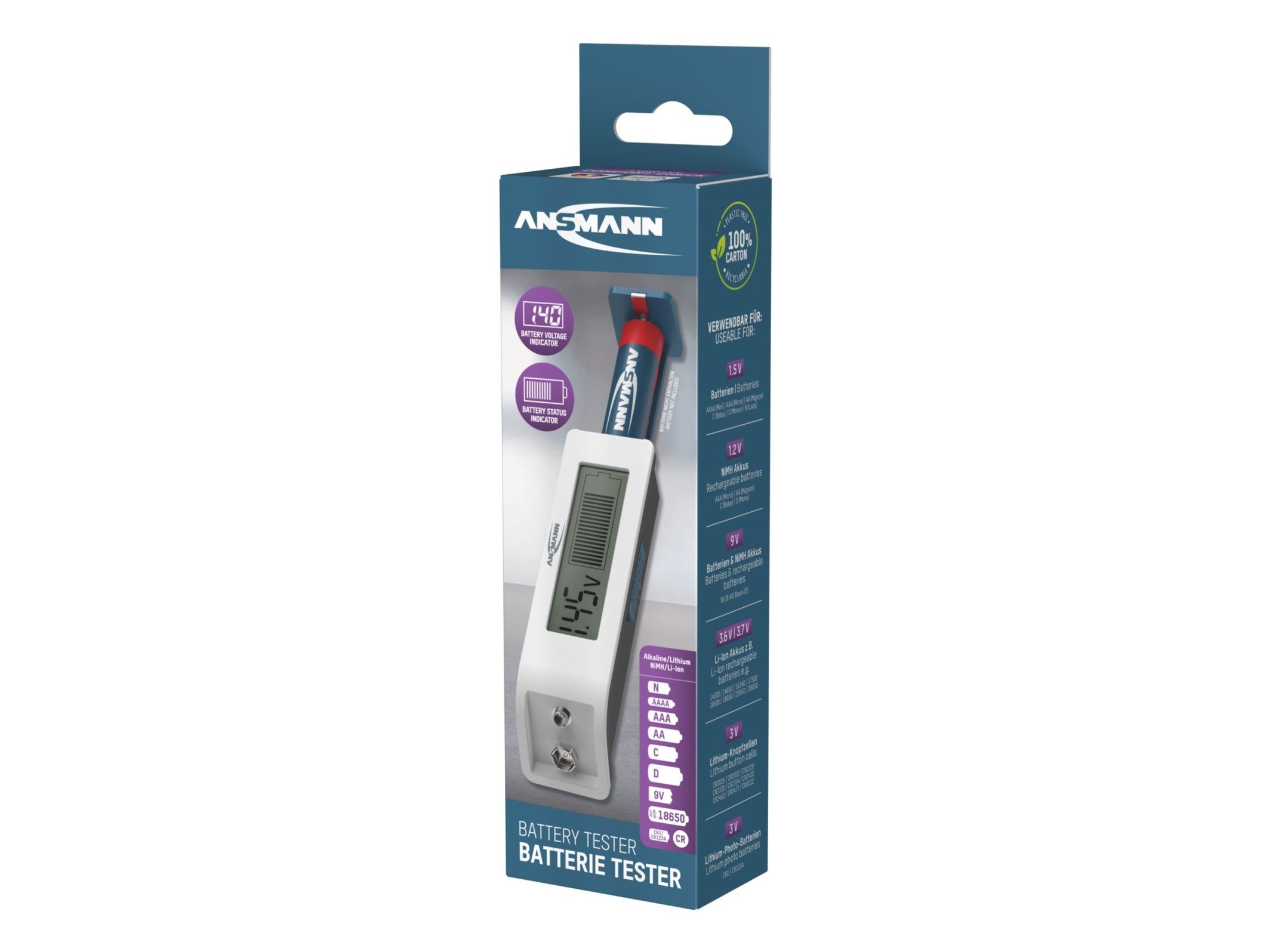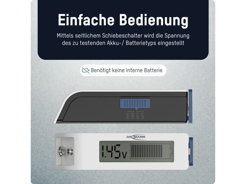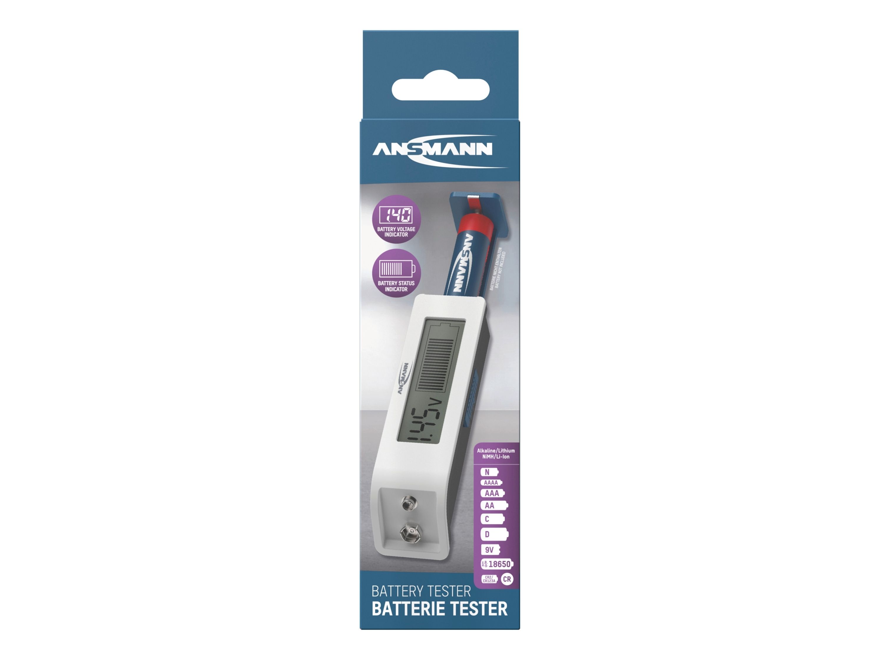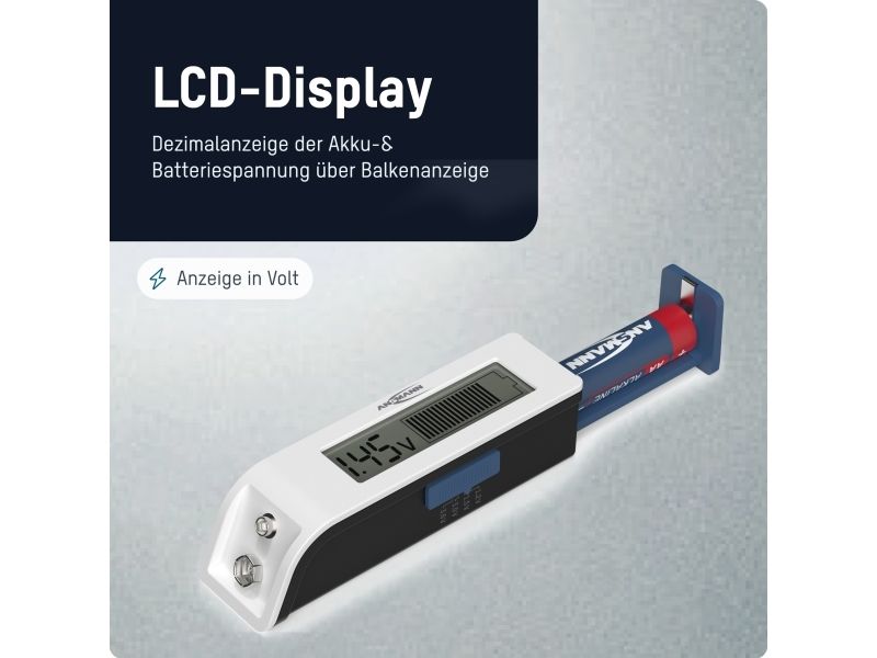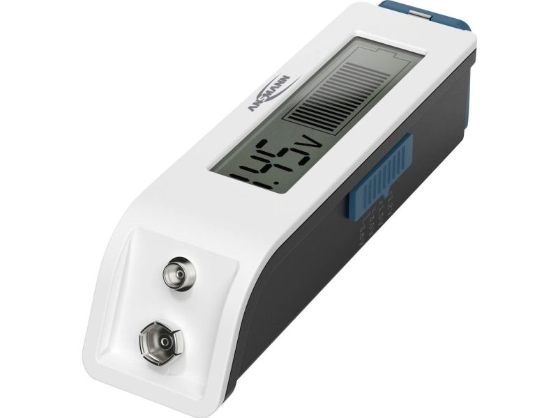 Simple operation The voltage of the battery type to be tested is set using the slide switch on the side: 1.2 V NiMH battery/1.5 V battery/3 V lithium battery/3.6 V Li-ion battery - Pull out the battery compartment on the side - Insert battery with correct polarity. - Close the battery compartment. - Display appears A 9 V block can be tested directly on the contacts. The position of the slide switch is not relevant for this. The tester itself does not require its own battery for power supply.Ansmann 1900-0110. Product colour: White, Compatible battery sizes: 9v, 18650, AA, AAA, AAAA, C, CR123A, CR2, CR2025, CR2032, D, No, Compatible battery technologies: Alkaline, Lithium, Lithium-Ion (Li-Ion), Nickel-Cadmium (NiCd), Nickel-Metal Hydride (NiMH). Display type: LCD. Width: 111 mm, Depth: 30 mm, Height: 27 mm. Package width: 84 mm, Package depth: 42 mm, Package height: 96 mm. Products per master (outer) case: 40 pc(s), Master (outer) case length: 348 mm, Master (outer) case width: 237 mm