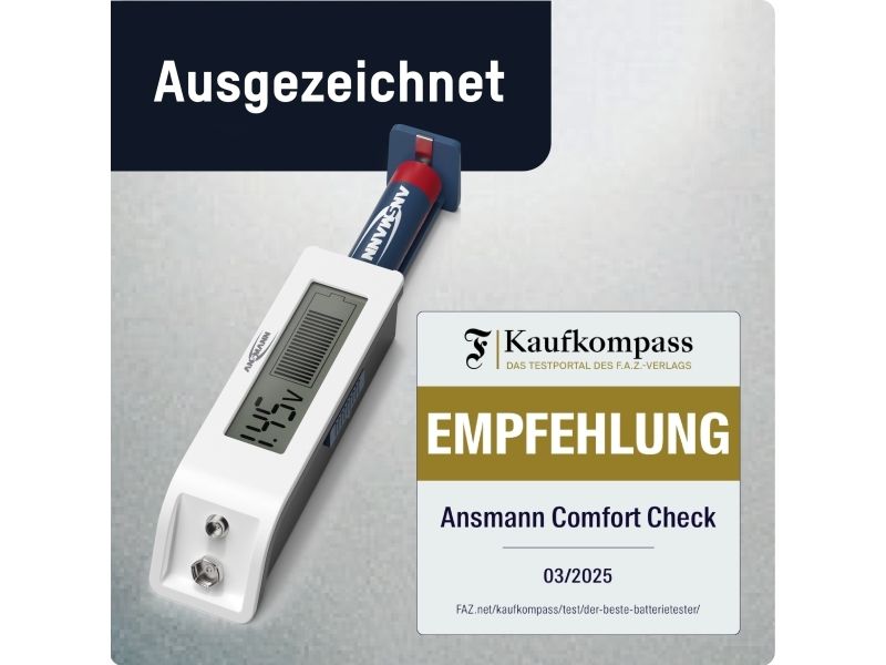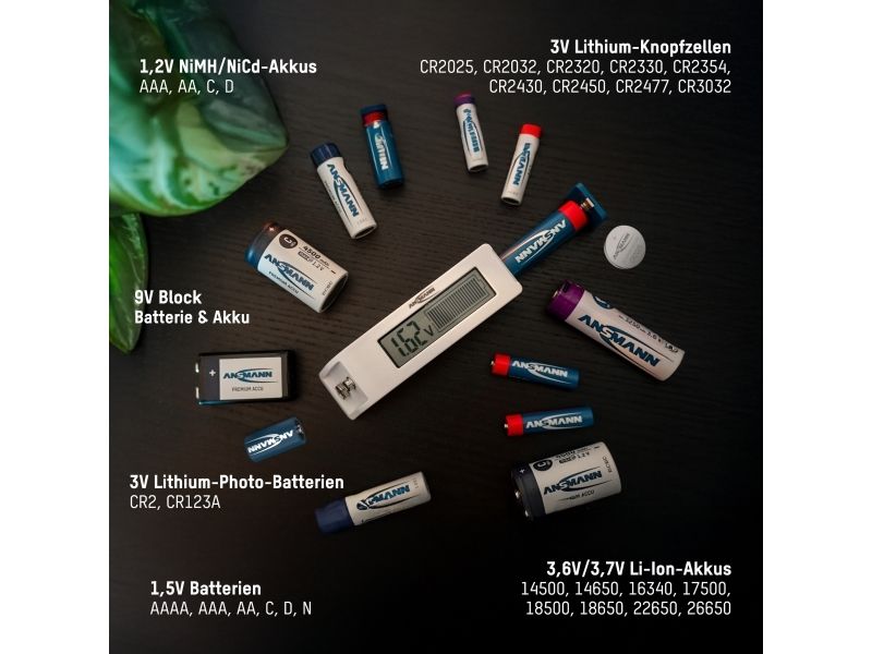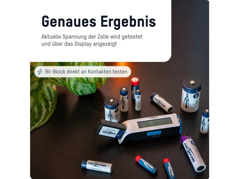 Test device for many battery and rechargeable battery types The compact and user-friendly tester checks the energy content of the most common primary batteries and rechargeable batteries within a very short time. This makes it easy to see whether your rechargeable battery still has sufficient power or should be replaced.