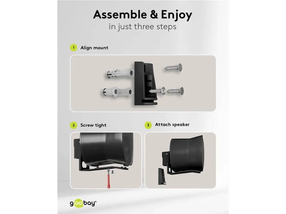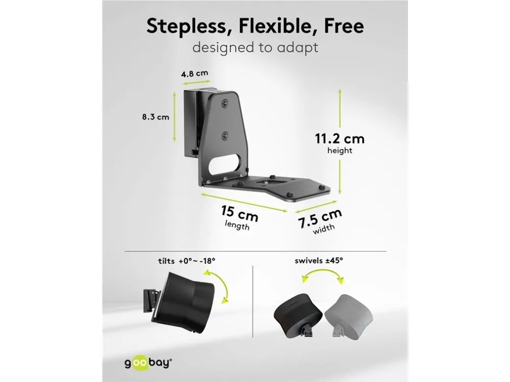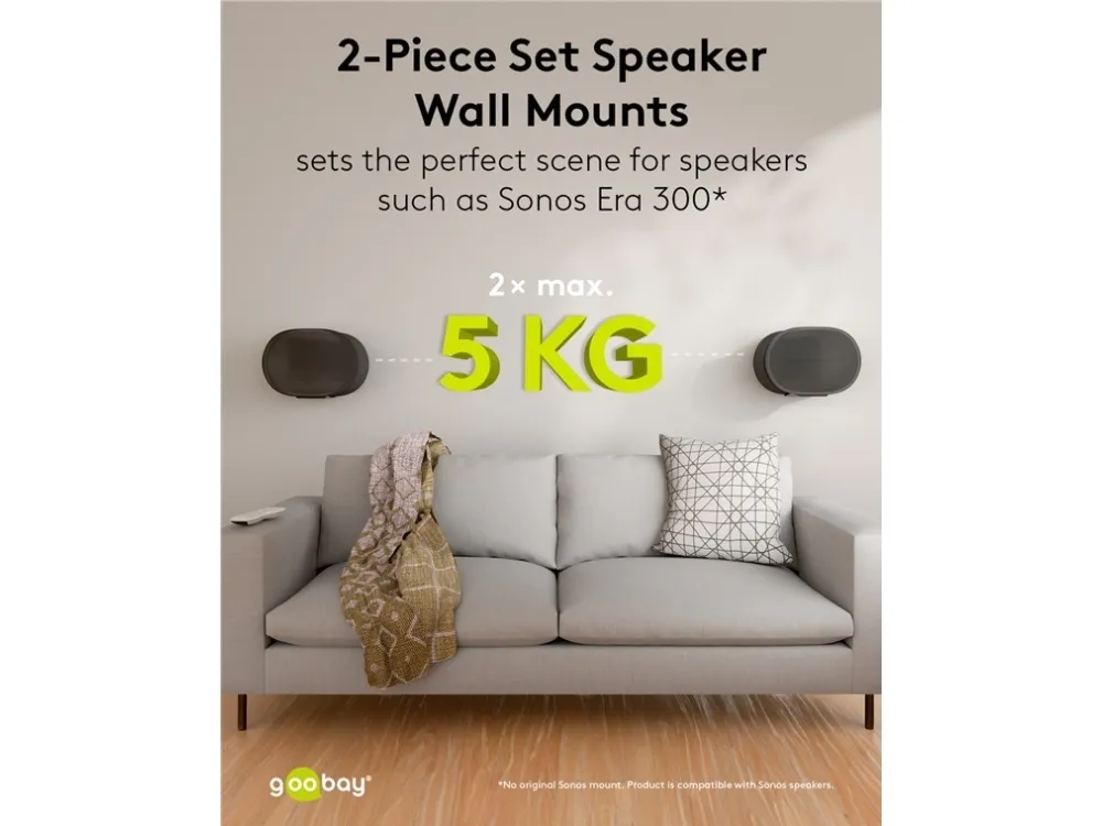 kompatibel mit dem Sonos Era 300 Lautsprecher-Halterung aus robustem Metall für die sichere Wandmontage von Satellitenlautsprechern bis 5 kg Kompatibel mit Lautsprechern wie dem Sonos Era 300 Im kompakten Format ist die Halterung überall platzierbar, um ein optimales Klangerlebnis zu erzielen Durch die stabilen Gelenke ist der Wandhalter stufenlos bis zu -18° neigbar und ±45° schwenkbar Mit großzügigem Kabeldurchlass für ein komfortables Anschließen und Abstöpseln der Audio- und Netzkabel Per Schraubmontage ist die Lautsprecher-Halterung einfach an der Wand zu befestigen