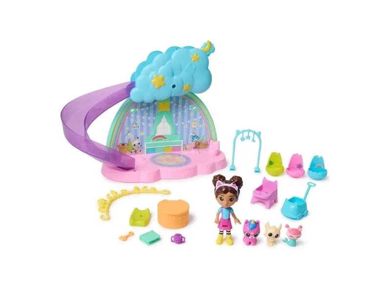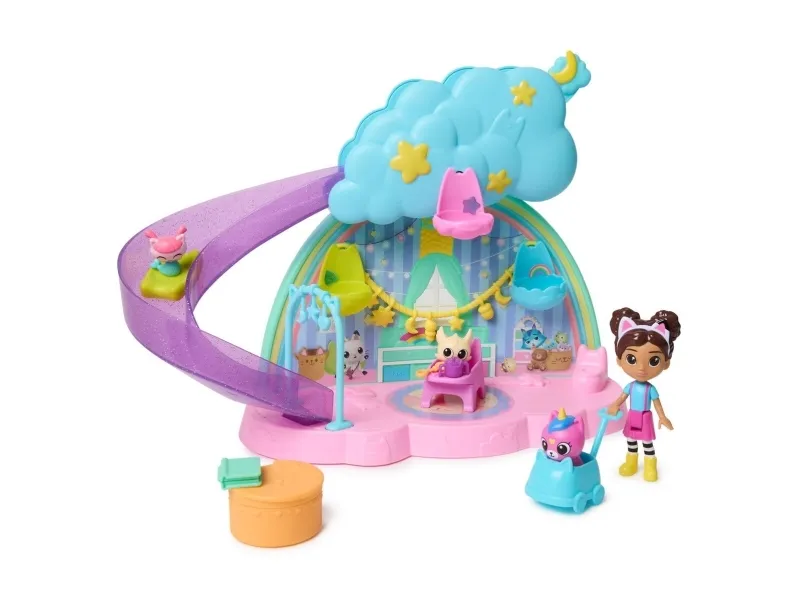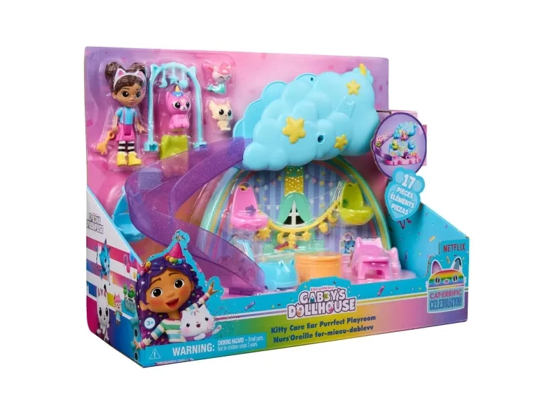 Create exciting babysitting adventures with Gabby and the baby kitties, in the Kitty Care Ear Purrfect Playroom! This 17-piece playset features a Gabby girl figure, 3 baby kitties and a nursery playset that’s full of surprises! Take turns going down the slide, enjoy walks in the pushcart, use the high chair at mealtimes, then unbox a dollhouse delivery to discover a surprise toy before scanning the QR code in the delivery to unlock a reward in the Gabby’s Dollhouse App! After playtime, tuck them into their bassinets and rock them to sleep. Gabby’s Dollhouse toys for girls & boys are gifts for kids that enjoy building pretend play doll house worlds. Make their entry into dollhouse play memorable with lovable toy figures, dollhouse accessories and dollhouse furniture to collect and configure! Build your world with house kit essentials like a play kitchen or a music room, and tons of items to collect, like an awesome cruise ship toy, a mermaid themed pool and the all-new Party Room Playset - dollhouse attic with an indoor skate park, and super cute dollhouse balconies with mini fidget toys, that provide satisfying sensory play and works seamlessly with both versions of the dollhouse!
