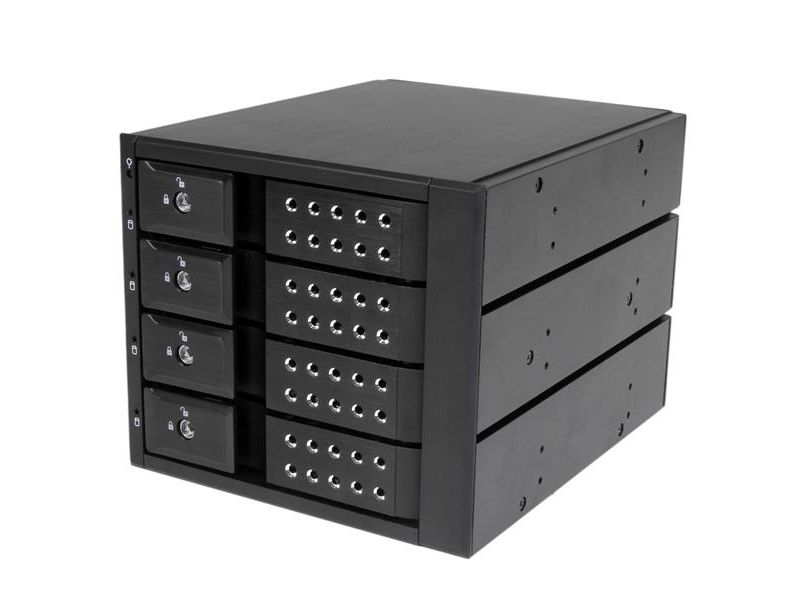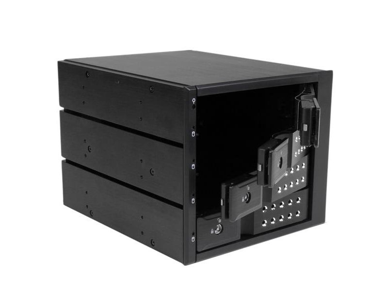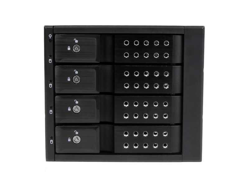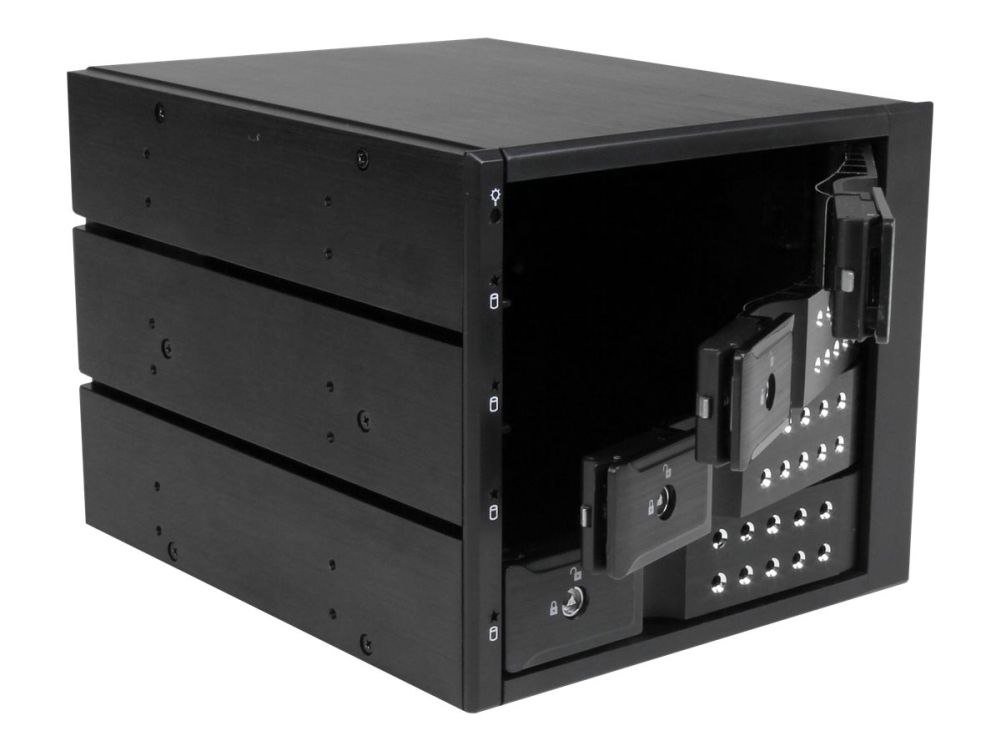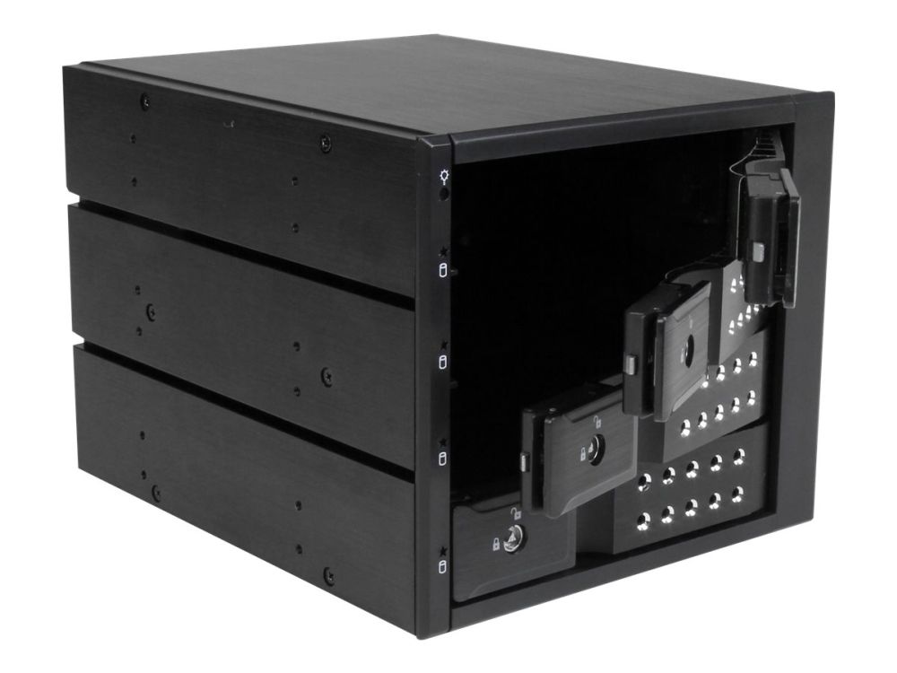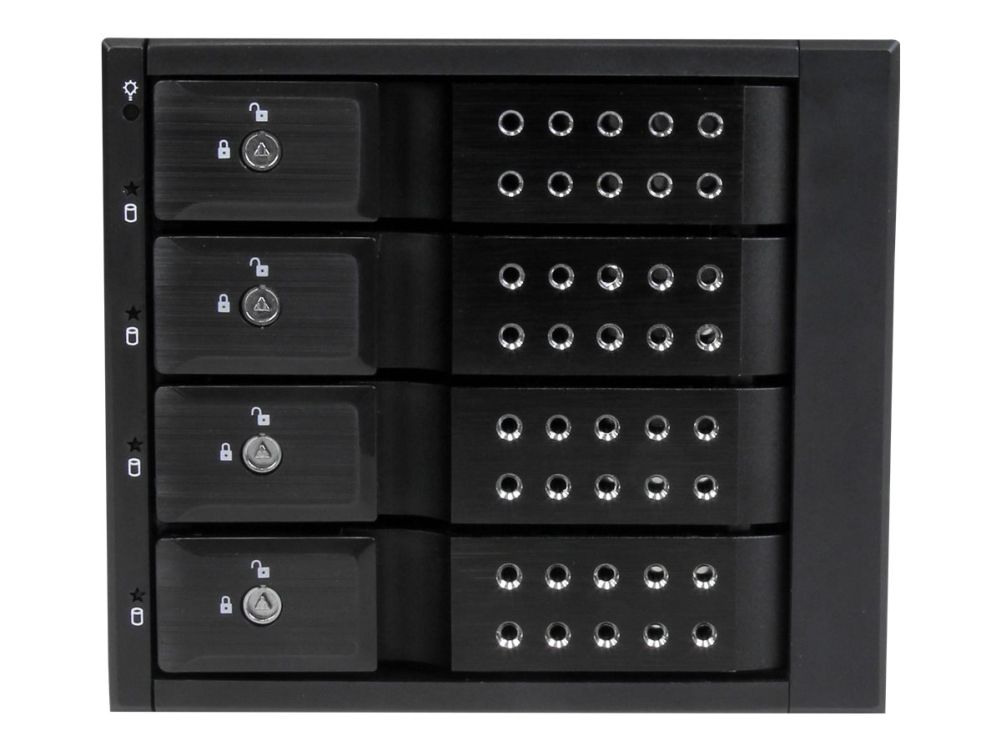 For a quick and secure method of installing and removing drives, the backplane features ejection levers and a key-lock design. To help prevent drive failure, the bay provides drive cooling with a built-in fan and excellent heat dissipation with a vented aluminum enclosure.