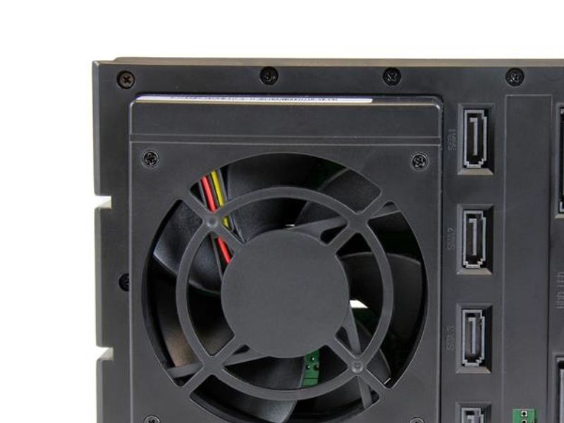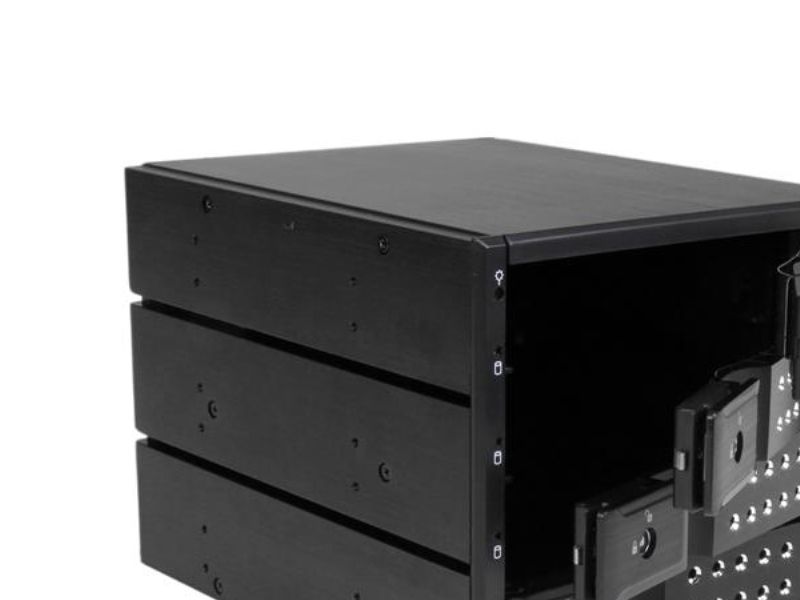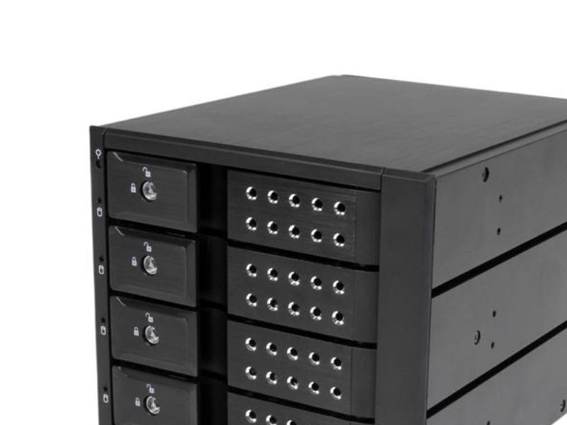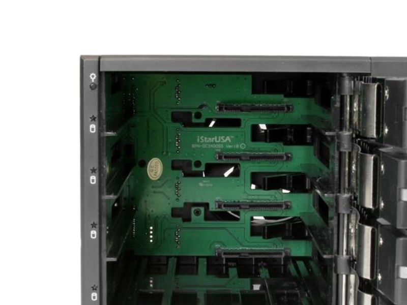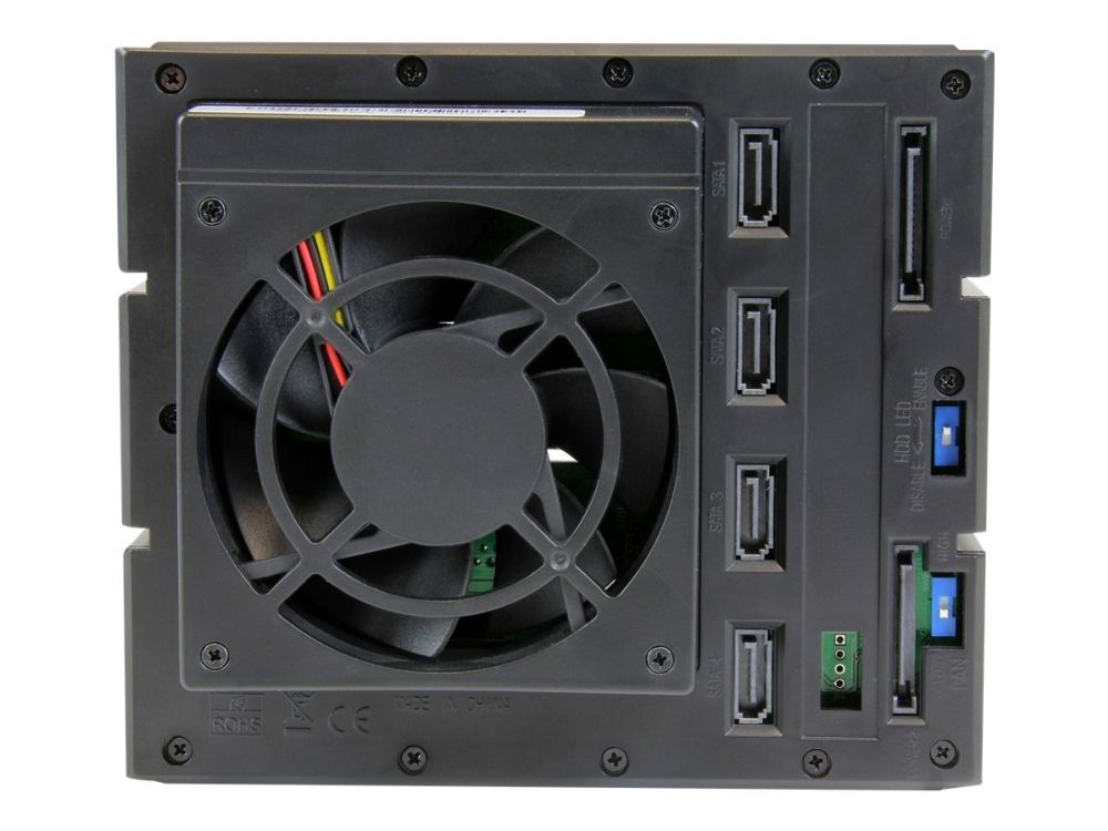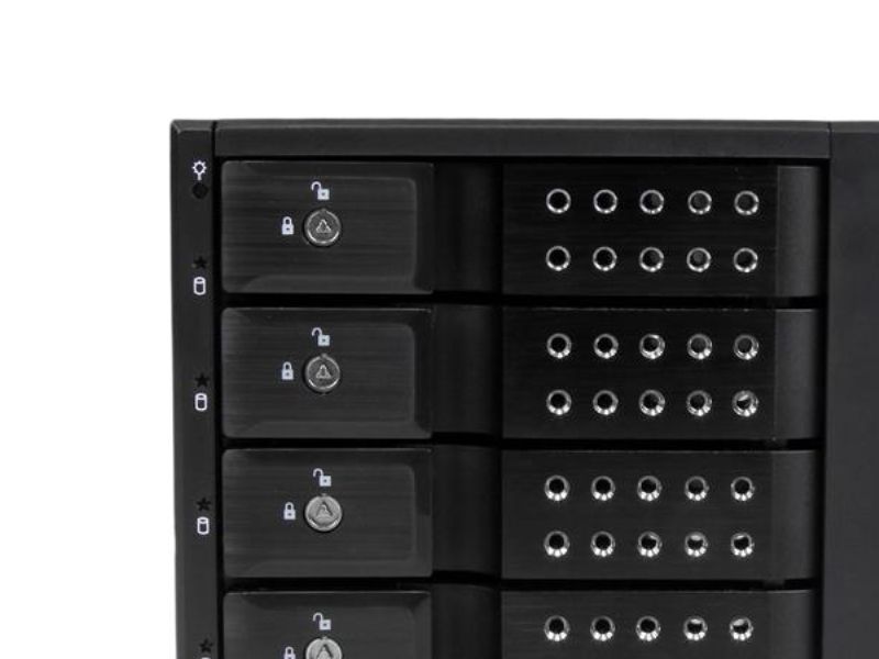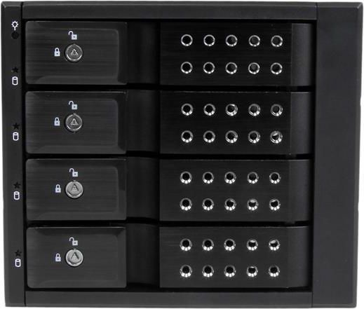 For a quick and secure method of installing and removing drives, the backplane features ejection levers and a key-lock design. To help prevent drive failure, the bay provides drive cooling with a built-in fan and excellent heat dissipation with a vented aluminum enclosure.