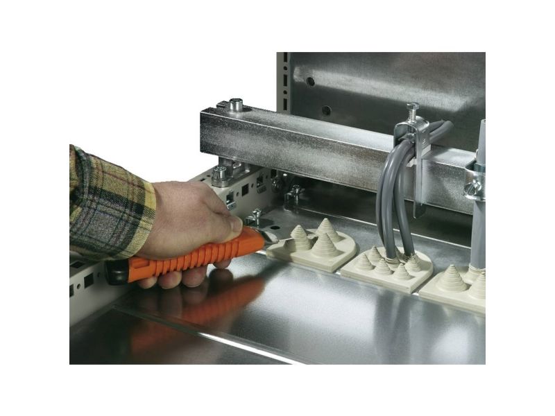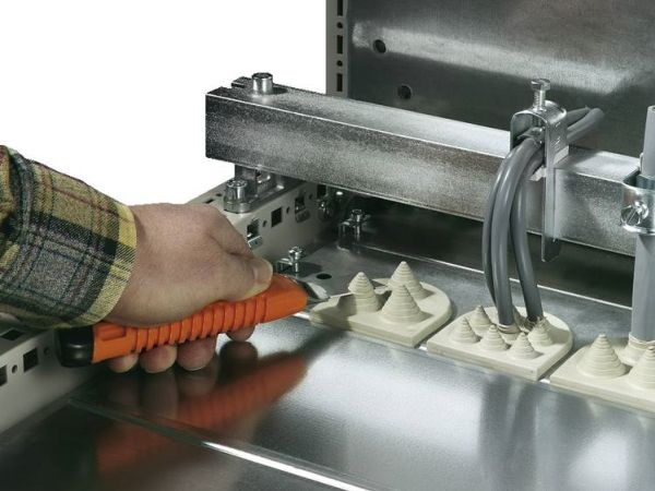 Für einfache und schnelle Abdichtung von im Bodenbereich der Schränke einzuführenden Kabeln.