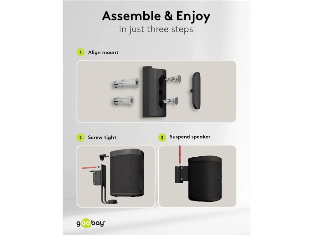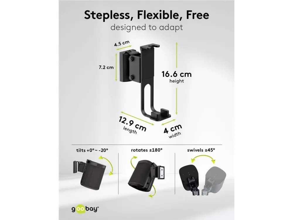 kompatibel mit dem Sonos One und Sonos One SL Lautsprecher-Halterung aus robustem Metall für die sichere Wandmontage von Satellitenlautsprechern bis 3 kg Kompatibel mit Lautsprechern wie dem Sonos One, Sonos One SL, Sonos Play:1 Durch die stabilen Gelenke ist der Wandhalter stufenlos bis zu -20° neigbar und ±45° schwenkbar Die Halterung ist zusätzlich um ±180° rotierbar, sodass der Lautsprecher auch kopfüber hängen kann Mit großzügigem Kabeldurchlass für ein komfortables Anschließen und Abstöpseln der Audio- und Netzkabel Per Schraubmontage ist die Lautsprecher-Halterung einfach an der Wand zu befestigen
