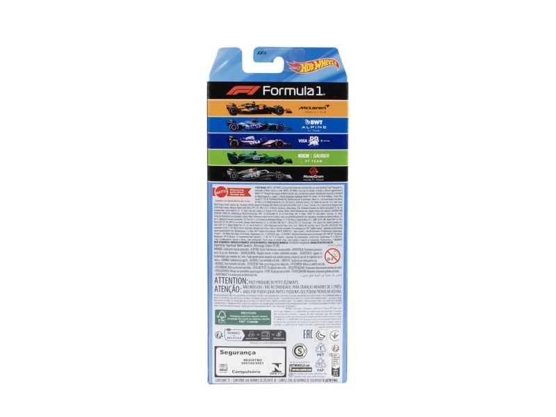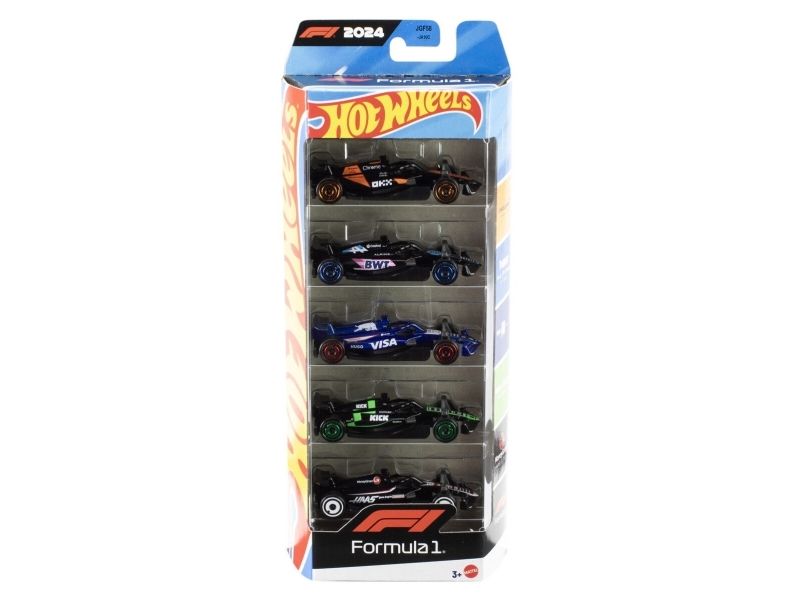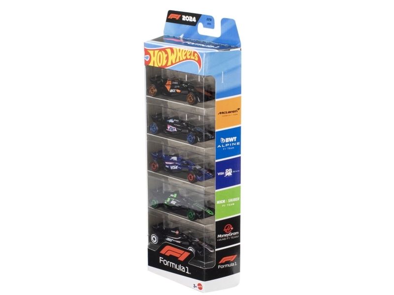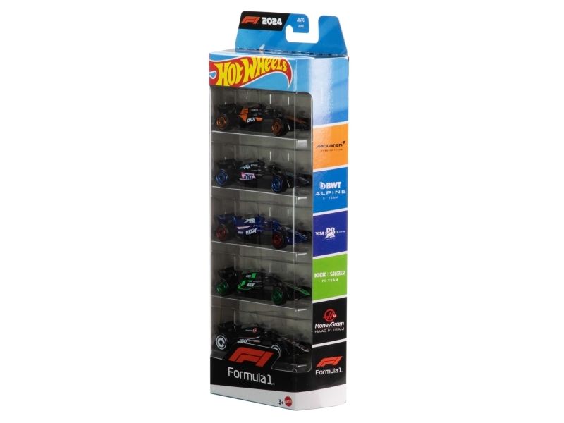 Speed into the high-octane action of Formula 1 with a 5-pack of Hot Wheels Formula 1 race cars in 1:64 scale. Each die-cast vehicle features graphics of five of the hottest racing teams on the circuit including McLaren F1 Team, BWT Alpine F1 Team, Visa Cash App RB Formula One Team, KICK Sauber F1 Team and MoneyGram Haas F1 Team. The set is designed for true automotive enthusiasts who appreciate the legacy and collectability of a Hot Wheels and Formula 1 collaboration. Put them on display or recreate legendary moments from the pinnacle of motorsport on Hot Wheels tracks. Track sold separately. Colours and decorations may vary.Hot Wheels 5-Pack Race Team, Set of 5 Formula 1-Themed 1:64 Scale Die-Cast Toy Cars. Product type: Vehicle set, Recommended age (min): 3 yr(s), Recommended age (max): 99 yr(s), Material: Metal, Product colour: Multicolour
