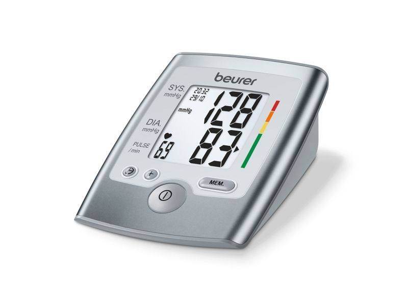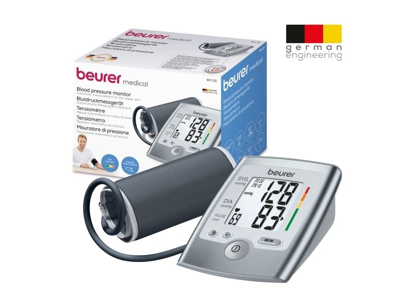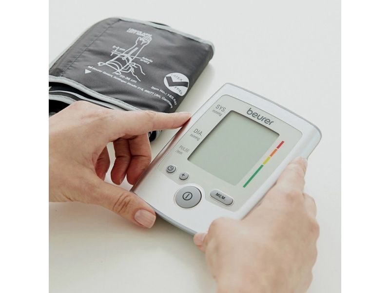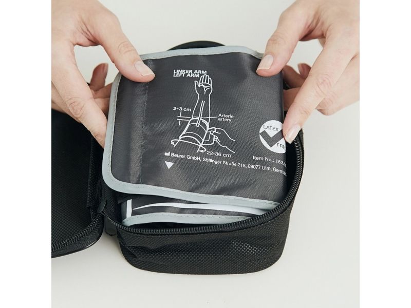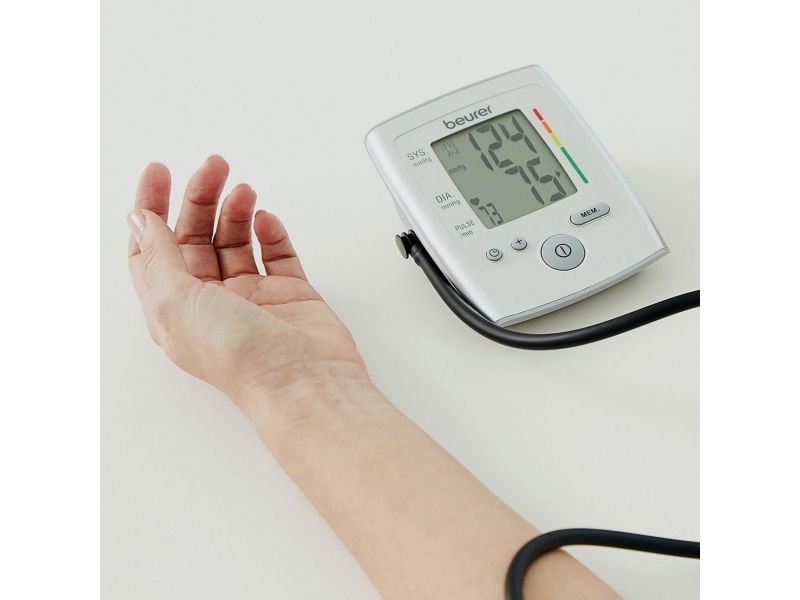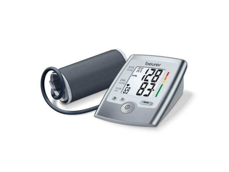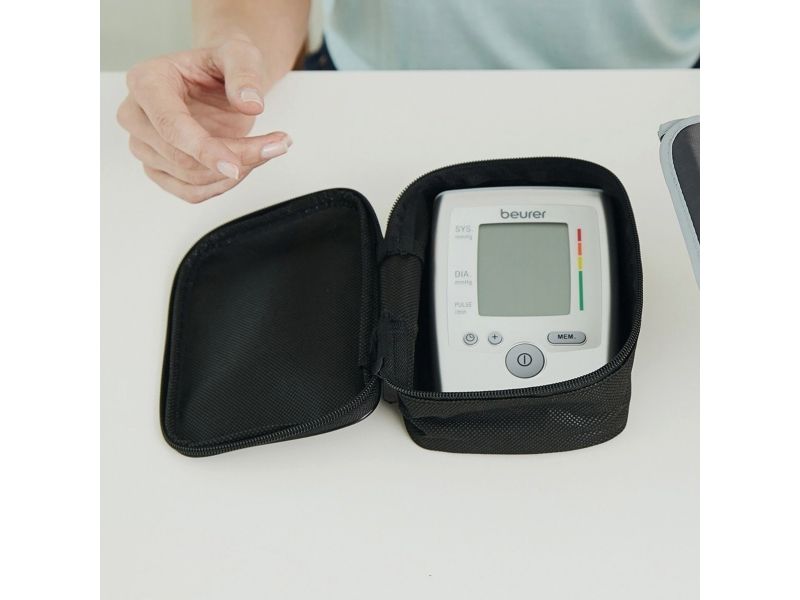 anvisninger vedrørende brugen• Mål altid blodtrykket på samme tid af døgnet for at sikre, atværdierne kan sammenlignes.• Hvil altid i 5 minutter før hver måling!• Hvis du ønsker at udføre flere målinger på en person, skal duvente 5 minutter mellem hver måling.• Du bør hverken spise, drikke, ryge eller være fysisk aktiv30 minutter før målingen.• Gentag målingen i tilfælde af tvivlsomme målinger.• De værdier, du selv finder frem til, er kun til din egen information – de kan ikke erstatte en lægeundersøgelse! Talmed lægen om dine måleværdier, træf ikke selv medicinskebeslutninger på baggrund af værdierne (f.eks. om medicin ogdosering)!• Anvend ikke blodtryksmåleren på nyfødte, gravide eller kvindelige patienter med svagerskabsforgiftning.• Sygdomme i hjerte-kredsløbssystemet kan medføre fejlmå-linger eller forringelser af målenøjagtigheden. Det sammegælder ved meget lavt blodtryk, diabetes, blodomløbs- ogrytmeforstyrrelser samt ved kuldegysninger eller rystelser.• Blodtryksmåleren må ikke anvendes sammen med et højfrekvent kirurgisk apparat.• Anvend kun apparatet til personer med et overarmsomfangsvarende til det, der er angivet for apparatet.• Vær opmærksom på, at oppumpningen kan medføre funktionsnedsættelse i den pågældende legemsdel.• Blodtryksmålingen må ikke standse blodcirkulationen i unø-digt lang tid. I tilfælde af en fejlfunktion på apparatet skal dutage manchetten af armen.• Undgå mekanisk indsnævring, sammentrykning eller knæk afmanchettens slange.• Undgå et vedvarende tryk i manchetten samt hyppige målinger. En deraf følgende nedsættelse af blodomløbet kan medføre personskader.• Sørg for, at manchetten ikke lægges på en arm, hvis arteriereller vener er under medicinsk behandling. f.eks. intravaskulær adgang eller en intravaskulær behandling eller en arteriovenøs (A-V-) shunt.• Læg ikke manchetten på personer, som har fået en brystamputation.• Læg ikke manchetten på oven på sår, da dette kan medføreyderligere kvæstelser.• Du kan bruge blodtryksmåleren med batterier eller en strømforsyning. Bemærk, at dataoverføring og datalagring kun ermulig, hvis der er strøm på blodtryksmåleren. Så snart batterierne er brugt op, eller strømforsyningen afbrydes fra lysnettet, mister blodtryksmåleren dato og klokkeslæt.4• Frakoblingsautomatikken slukker for blodtryksmåleren for atspare på batterierne, når der i 1 minut ikke er blevet rørt vednogen knapper.• Apparatet er kun beregnet til de formål, som er beskrevet idenne brugsanvisning. Producenten hæfter ikke for skader,der opstår som følge af ukorrekt brug eller brug i strid medformålet.Henvisninger til opbevaring og vedligeholdelse• Blodtryksmåleren består af præcisions- og elektronik-komponenter. Nøjagtigheden af måleværdierne og apparatetslevetid afhænger af omhyggelig behandling af apparatet:– Beskyt apparatet mod stød, fugt, snavs, stærke temperaturudsving og direkte sollys.– Undgå at apparatet falder ned.– Anvend ikke apparatet i nærheden af kraftige elektromagnetiske felter, dvs. at det skal holdes væk fra bl.a. radioanlæg og mobiltelefoner.– Brug kun de medleverede eller originale erstatningsmanchetter. Ellers bestemmes der forkerte måleværdier.• Undlad at trykke på nogen knapper, så længe manchettenikke er sat på.• Det anbefales at tage batterierne ud, hvis apparatet ikke skalbruges i længere tid.Henvisninger til batterier• Det kan være livsfarligt at sluge batterier. Derfor skal batterierne og produktet opbevares utilgængelige for børn. Hvis enperson alligevel kommer til at sluge et batteri, skal der strakssøges læge.• Batterierne må ikke oplades eller genaktiveres med andremidler, skilles ad, kastes i åben ild eller kortsluttes.• Tag batterierne ud af apparatet, når de er brugt op, ellerapparatet ikke skal bruges i længere tid. Derved undgåsde skader, der kan opstå hvis væske løber ud af batteriet.Udskift altid alle batterier samtidig.• Brug ikke forskellige batterityper, batterimærker eller batteriermed forskellig kapacitet. Brug fortrinsvis Alkaline-batterier.Henvisninger til reparation og bortskaffelse• Batterier må ikke smides i husholdningsaffaldet. Bortskaf debrugte batterier på et passende indsamlingssted.• Åbn aldrig apparatet. Garantien bortfalder, hvis dette ikkeoverholdes.• Du må ikke selv foretage reparation eller justering af apparatet. I dette tilfælde kan der ikke garanteres en fejlfri funktion.• Reparationer må kun udføres af Beuer-kundeservice eller afautoriserede forhandlere. Afprøv altid batterierne inden eneventuel reklamation og udskift dem om nødvendigt.• Apparatet skal bortskaffes i henhold til Rådetsdirektiv vedrørende elektronisk affald – WEEE (WasteElectrical and Electronic Equipment).Har du spørgsmål til bortskaffelsen, kan du rette henvendelse til de ansvarlige kommunale myndigheder.