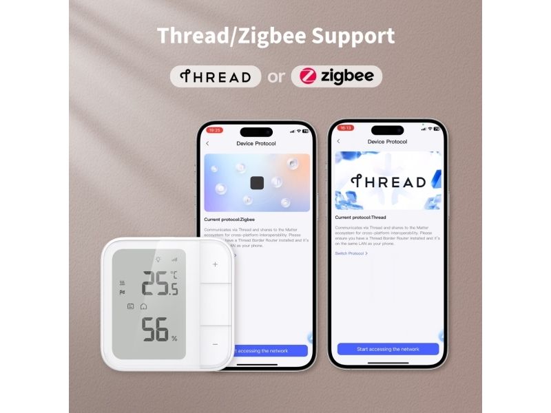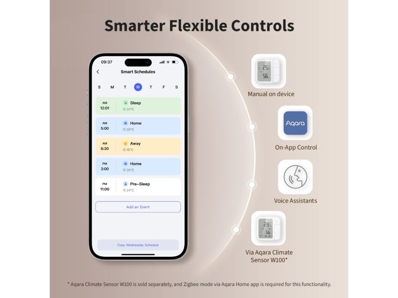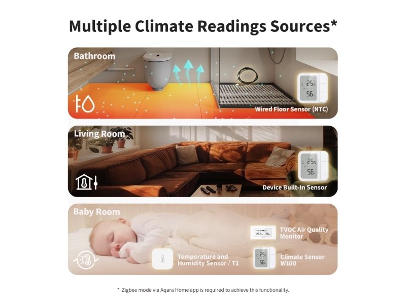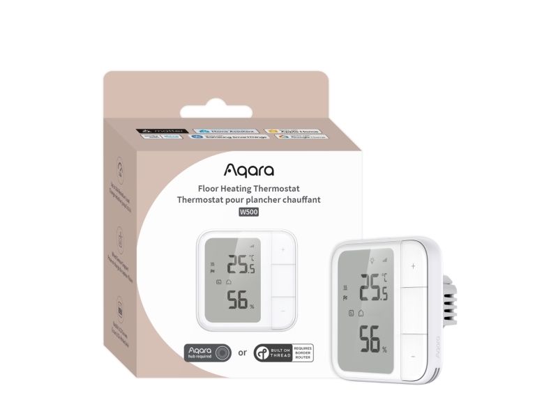 The Floor Heating Thermostat W500 supports Thread and Zigbee for seamless integration with third-party ecosystems, suitable for electric/hydronic heating systems①. It allows for the connection of an NTC floor sensor or an external Aqara sensor, offering features such as remote control, smart scheduling, and power monitoring, which help enhance home comfort and energy efficiency.
