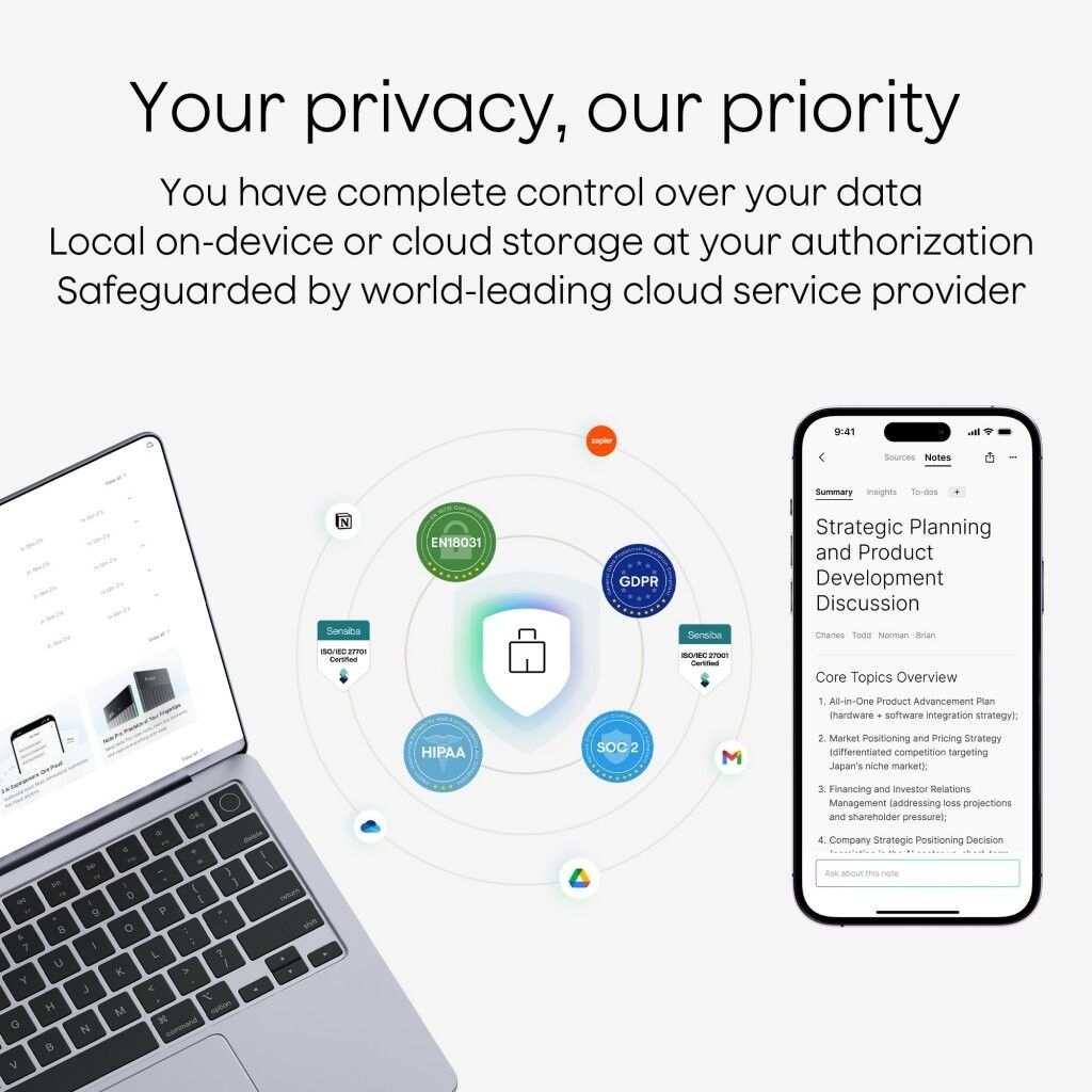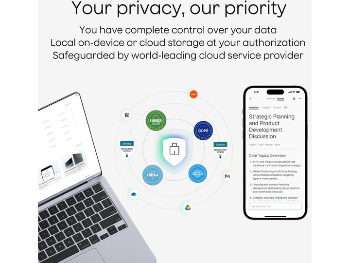 Plaud ist vollständig GDPR compliant, was das Engagement von Plaud für höchste Datenschutzstandards unterstreicht. Zusammen mit der Einhaltung von SOC 2 Type II und HIPAA werden Ihre Aufnahmen und KI-generierten Notizen stets mit Verschlüsselung auf Enterprise-Niveau geschützt—sodass Fachleute in ganz Europa und weltweit PLAUD mit vollem Vertrauen in ihre Privatsphäre nutzen können.