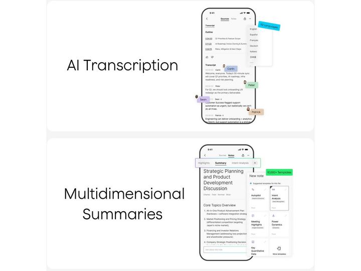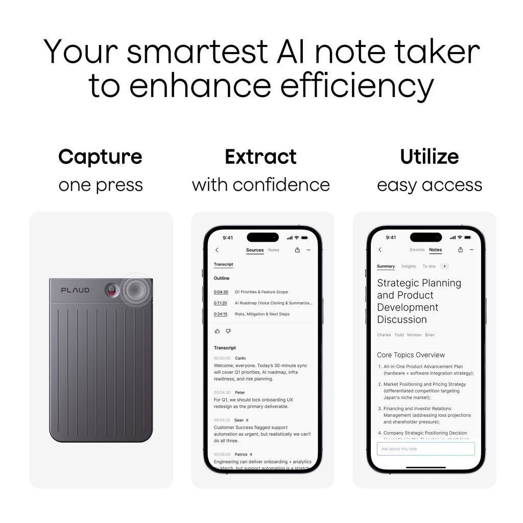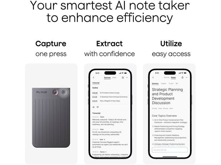 Plaud Note wandelt Aufnahmen in verwertbares Wissen um mit automatischer Spracherkennung, Sprecherkennzeichnung und Unterstützung für benutzerdefiniertes Vokabular zur Verbesserung der Genauigkeit. KI-generierte Zusammenfassungen und strukturierte Notizen heben wichtige Punkte und Maßnahmen hervor mithilfe von über 10.000 KI-gestützten Vorlagen für verschiedene Branchen. Markieren Sie wichtige Momente, fügen Sie geschriebene Notizen oder Bilder hinzu und nutzen Sie Ask PLAUD, um direkt in Transkriptionen und Zusammenfassungen zu suchen, ohne die Aufnahmen erneut abzuspielen.