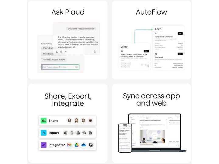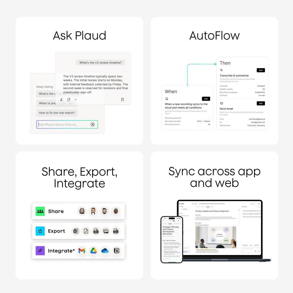 Plaud Note integriert sich nahtlos mit den Plaud-Apps für Mobilgeräte, Web und Desktop und bündelt Aufnahmen, Transkriptionen, Zusammenfassungen und KI-Erkenntnisse in einem gemeinsamen Arbeitsbereich. Mit den Apps können Sie Inhalte überprüfen, durchsuchen, markieren und Fragen stellen mit Ask PLAUD, während die PLAUD Desktop-App Online-Meetings direkt von Plattformen wie Google Meet, Zoom und Teams aufzeichnen kann — sodass physische und virtuelle Gespräche an einem Ort organisiert bleiben