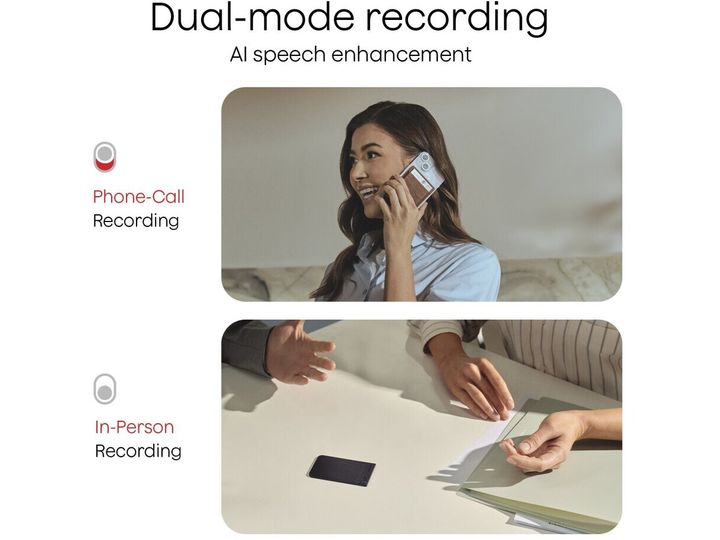 Erleben Sie eine unvergleichliche Aufnahmequalität mit dem fortschrittlichen Dual-Mode-Aufnahmesystem von Plaud Note. Das Gerät zeichnet physische Meetings mit Umgebungsaufnahme auf, während die innovative Vibration Conduction Sensor (V.C.S.)-Technologie kristallklare Aufnahmen von Telefongesprächen gewährleistet, wenn es magnetisch an Ihrem Smartphone befestigt ist.