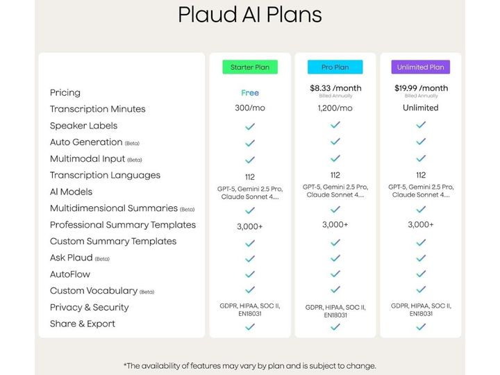 ※ *Der kostenlose Starter-Plan beinhaltet 300 Minuten/Monat KI-Transkription. Für zusätzliche Minuten können Sie auf den Pro Plan oder Unlimited Plan upgraden oder zusätzliche Kontingente über diesen Link erwerben: Plaud Subscription