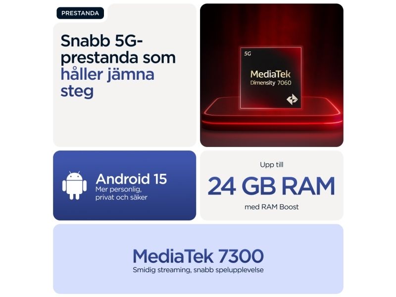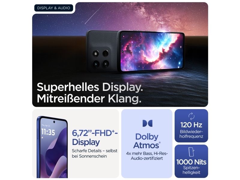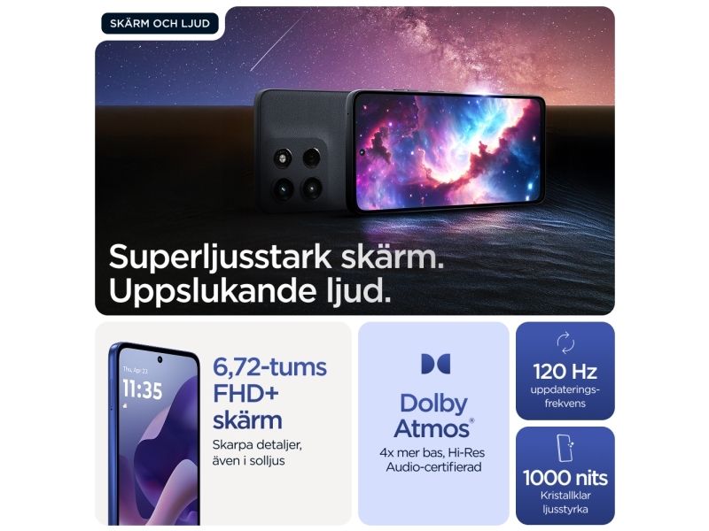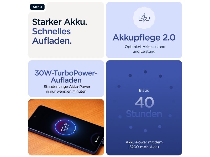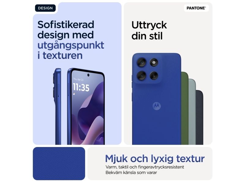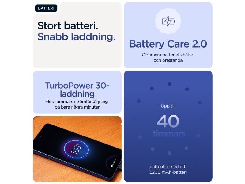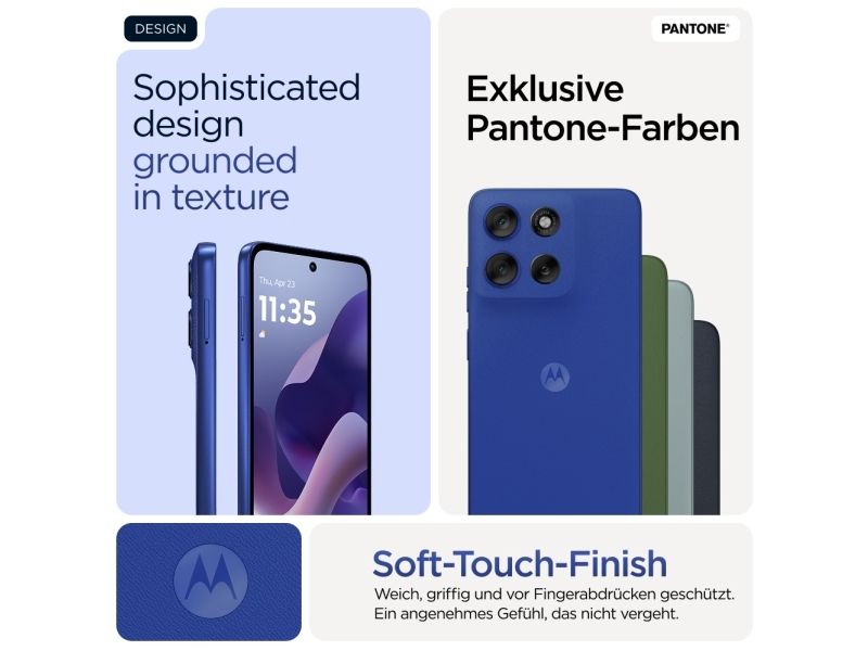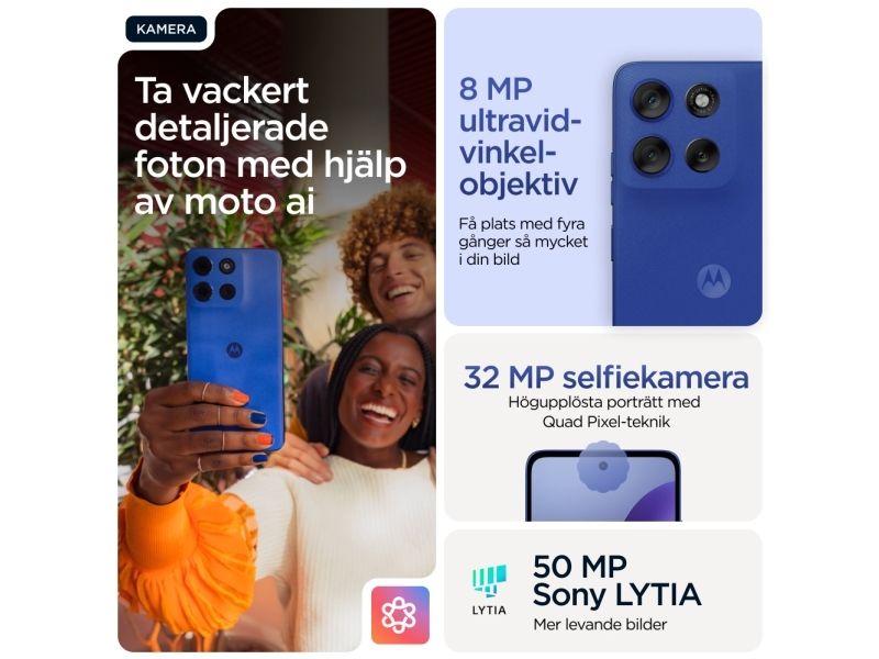 Beautifully built. Durably designed. Introducing the moto g56 5G, combining beautiful design with practical durability. Enjoy the soft feel of an easy-to-grip, premium finish—plus worry-free underwater protection, extreme temperature resistance, and a scratch-resistant screen.(1,2) Enhance your entertainment on a super-bright 6.72” FHD+ display backed by powerful stereo speakers with Bass Boost. Capture outstanding photos in any light with a 50MP Sony LYTIA™ camera powered by moto ai. Get hours of power in just minutes with blazing-fast TurboPower™charging.(3,4) Unleash the power of an octa-core processor at 5G speeds.(5) Plus, get plenty of storage for photos, movies, songs, and apps. The new moto g56 5G. Durability is beautiful.Motorola moto g56 5G . Display diagonal: 17.1 cm (6.72"), Display resolution: 2400 x 1080 pixels. Processor frequency: 2.6 GHz, Processor family: MediaTek Dimensity, Processor model: 7060. RAM capacity: 8 GB, Internal storage capacity: 256 GB. Rear camera resolution (numeric): 50 MP, Rear camera type: Dual camera. SIM card capability: Hybrid Dual SIM. Operating system installed: Android 15. Battery capacity: 5200 mAh. Product colour: Blue. Weight: 200 g