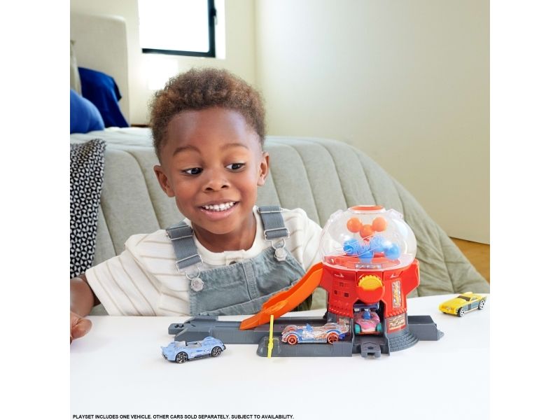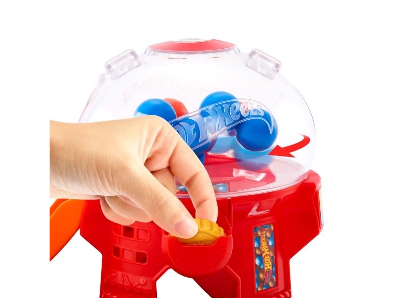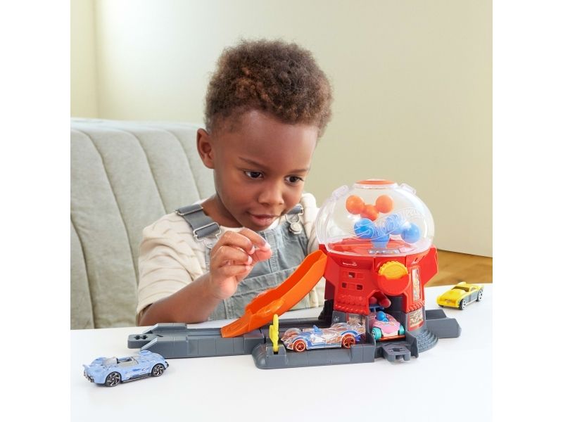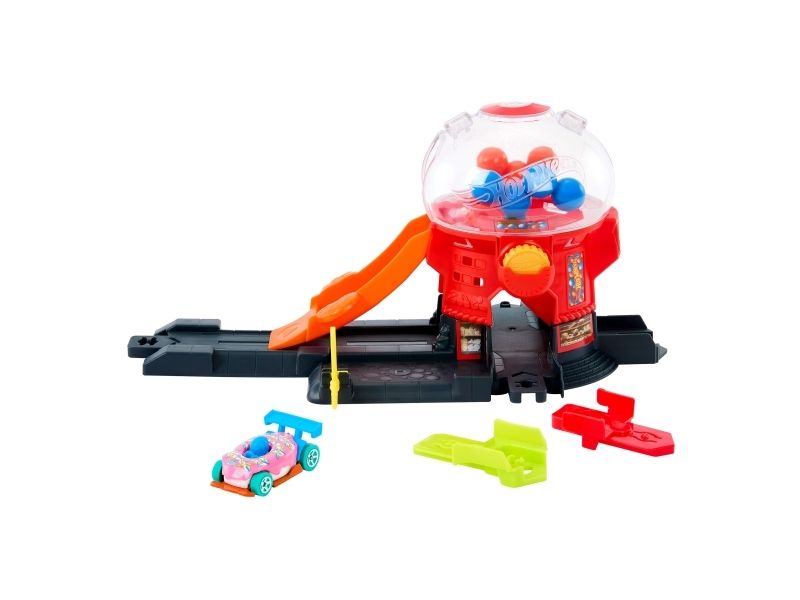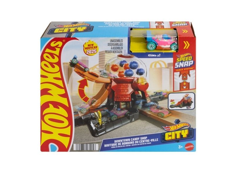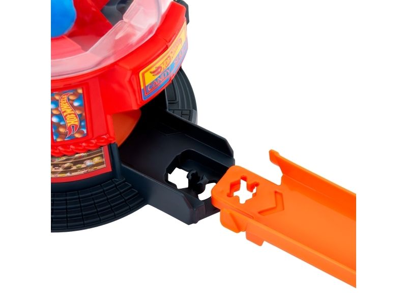 Speed through the sweetest spot in Hot Wheels City with the Hot Wheels Downtown Candy Shop. This gumball-machine shaped set inspires creative storytelling as kids drive their toy cars up the gravity-drop ramp and into the gumball machine. Press the coin slot down to make the gumballs move and launch the car down the exit ramp. On the base, there's a moveable gate for interactive play and parking for additional cars. The set can connect to other Hot Wheels sets and tracks using the Speed Snap Track system. One vehicle is included; additional vehicles, tracks and sets sold separately. Colours and decorations may vary.Hot Wheels City Downtown Candy Shop Playset & 1:64 Scale Die-Cast Toy Car, Speed Snap Track. Product type: Vehicle & track set, Recommended age (min): 3 yr(s), Recommended age (max): 99 yr(s), Material: Plastic, Product colour: Multicolour