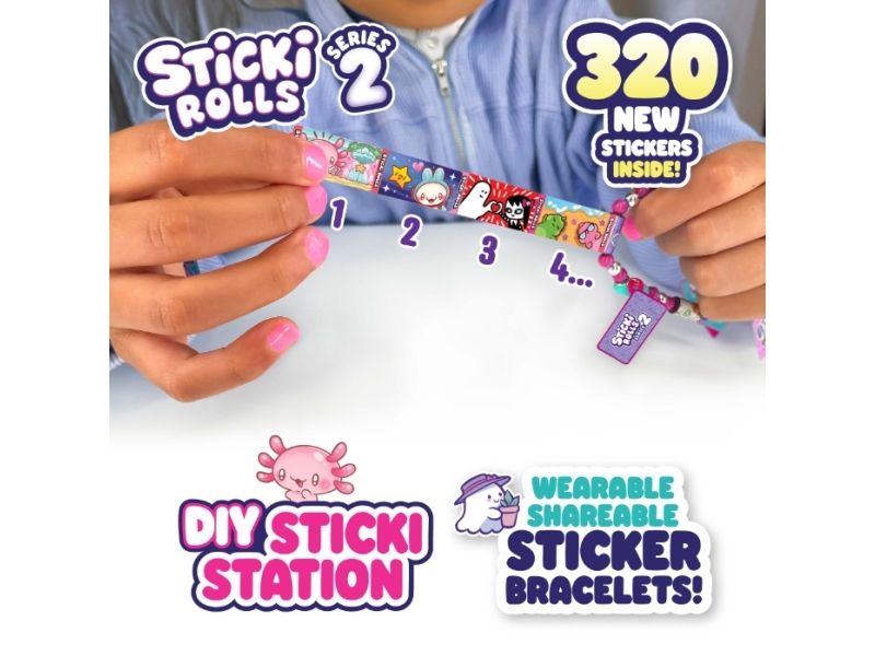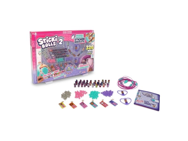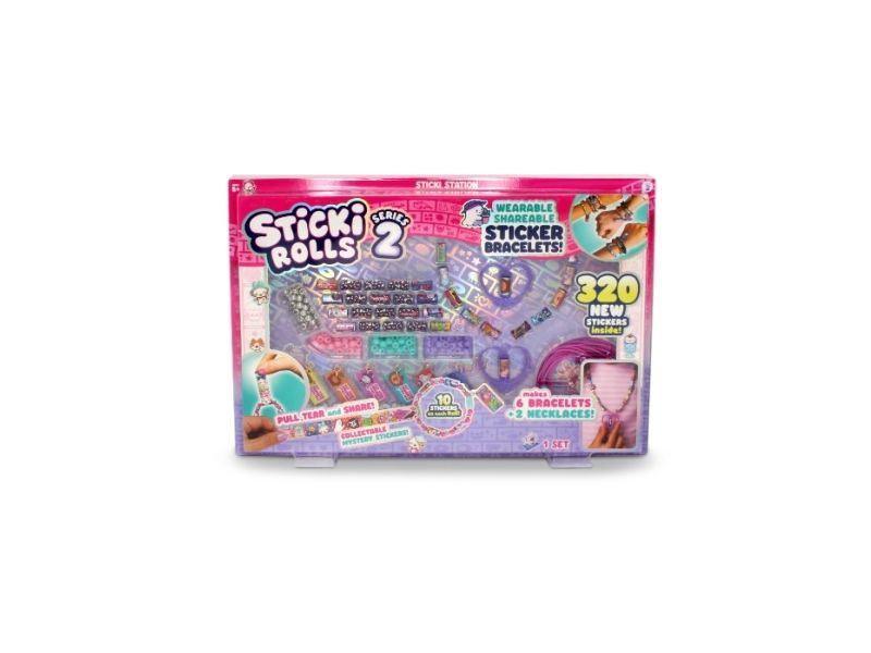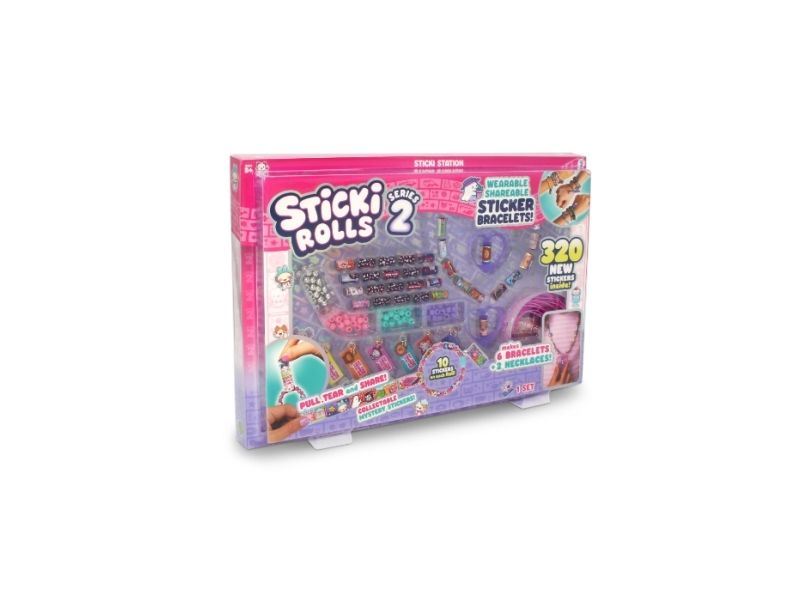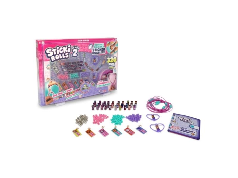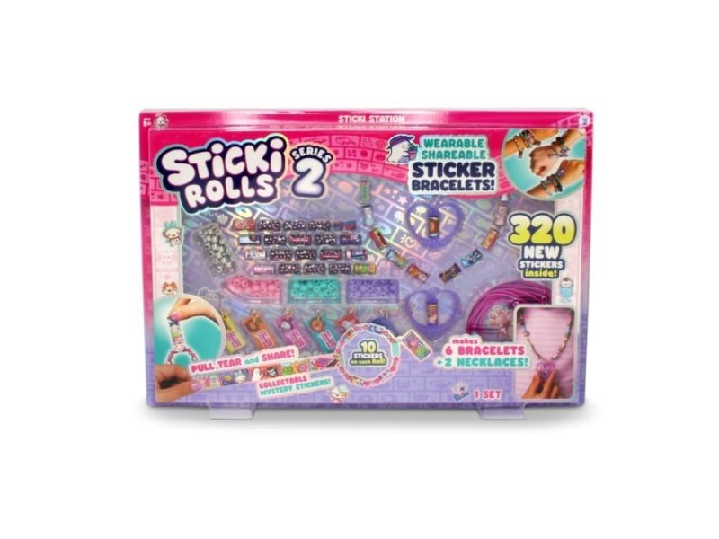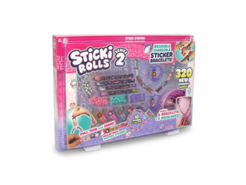 The Sticki Station comes with 32 rolls of brand new stickers, each containing 10 unique, Kawaii-themed designs, giving you a total of 320 stickers to pull, twist, and stick. Build 6 bracelets and 2 necklaces using the 144 upgraded beads and exclusive Series 2 necklace pendants that hold and dispense your favourite Sticki Roll stickers, plus six Charm Tags.