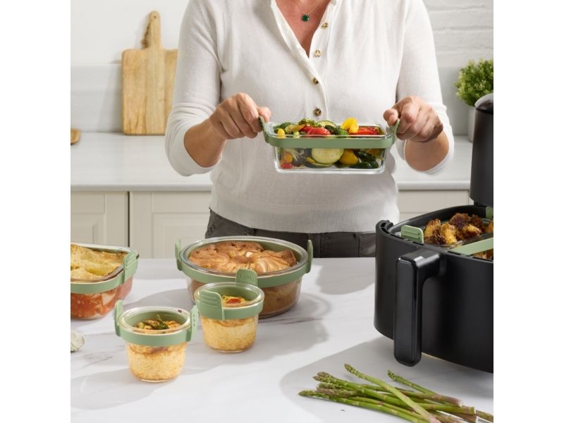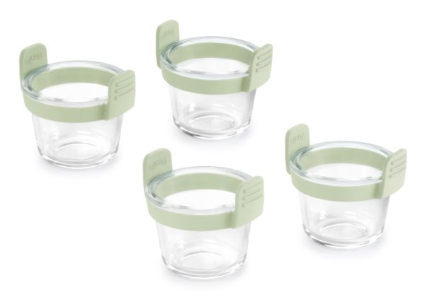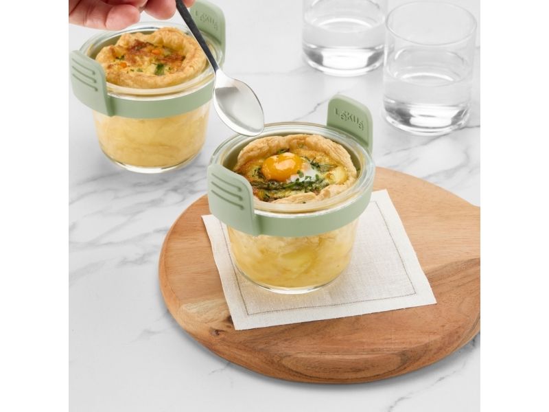 Enjoy your meals with these practical and durable Air Fryer Glass Mini Cups. They feature non-slip platinum silicone handles for more comfortable use. These cups are designed to help you cook air fryer recipes in perfect portions for one person. A practical and perfect solution for everyday use. They're also perfect for preparing easy desserts and enjoying them directly from the cup! This set of 4 cups is perfect for air fryers from 5L. Lékué 890284. Shape: Square, Material: Glass, Number of persons: 4 person(s). Width: 109 mm, Depth: 95 mm, Height: 96 mm