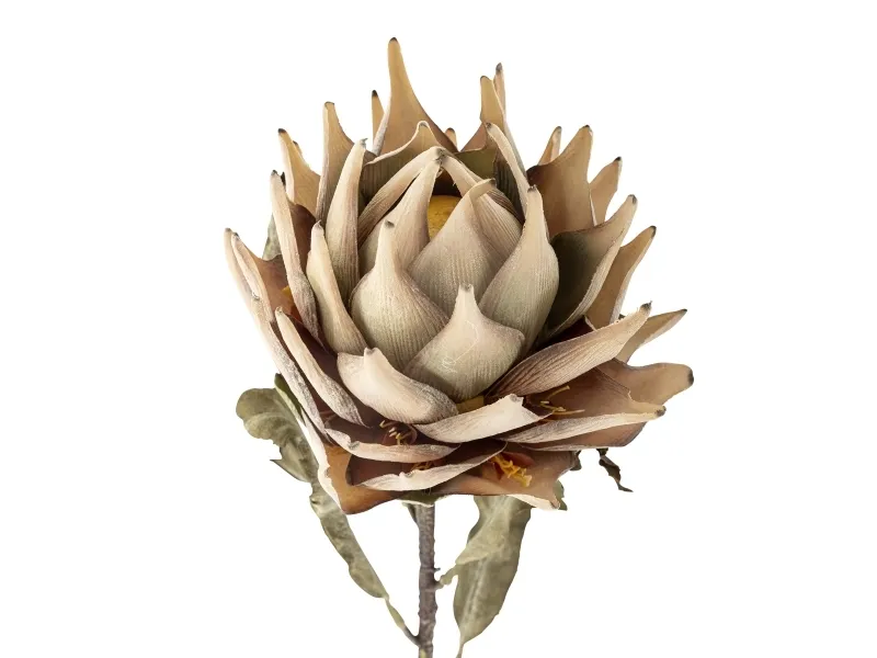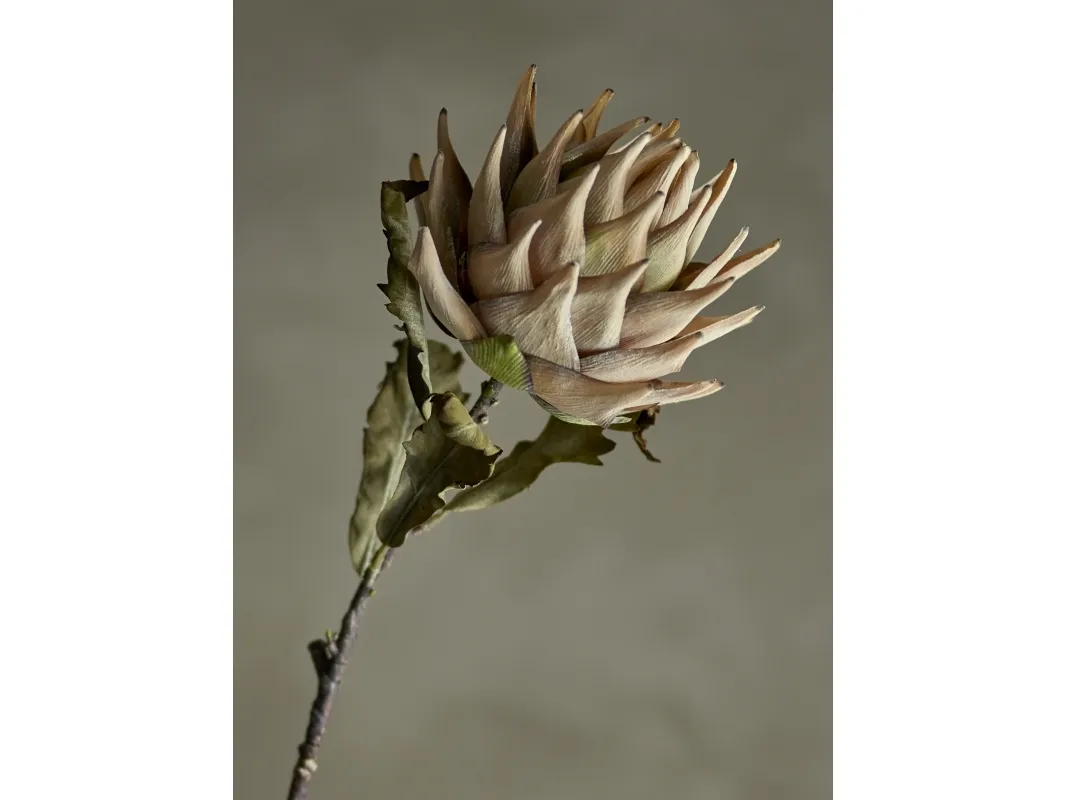 Protea Künstlich Einzelstiel von Bloomingville zeichnet sich durch helle, cremefarbene Blütenblätter aus, die in einer dichten, kunstvollen Formation angeordnet sind und jedem Dekor ein anspruchsvolles und organisches Element hinzufügen. Mit seiner Schönheit ist die große Blüte eine ideale Lösung für diejenigen, die die Pracht von Blumen genießen möchten, ohne sich um Langlebigkeit und Pflege sorgen zu müssen. Formen Sie den Stiel vor Gebrauch, um das natürliche Aussehen der Pflanze zu betonen und ihn an Ihre persönliche Dekoration anzupassen.