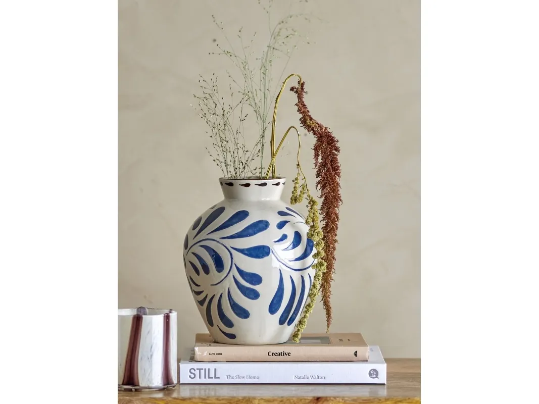 Handgemalte Details zieren die Heikki Vase von Bloomingville und symbolisieren die Perfektion des Handgemachten und die Schönheit, wie Variationen in Farben, Formen und Materialien Einzigartigkeit schaffen. Die Vase ist aus Steingut wunderschön gefertigt mit einem lieblichen geprägten blauen Muster. Da die Vase handdekoriert ist, können Variationen in Farbe und Muster auftreten.