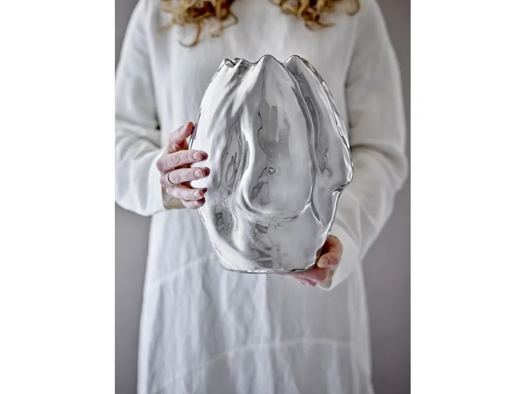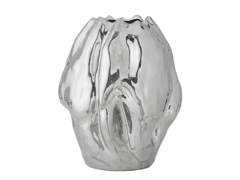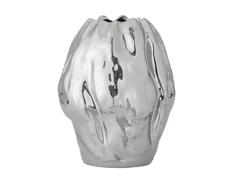 Die Vase Bobby von Bloomingville ist aus Steingut gefertigt und hat eine glänzende silberfarbene Oberfläche, die das Licht schön einfängt. Die organische Form und der elegante Look machen die Vase zu einem dekorativen Detail in Ihrem Zuhause.