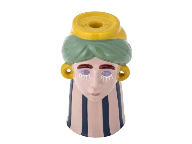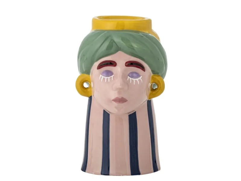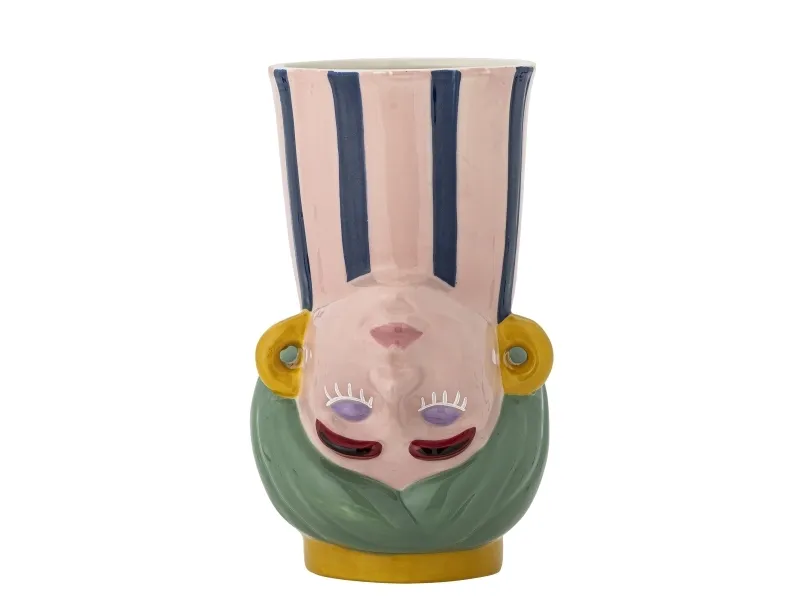 Die Vase Miss Jody von Bloomingville hat eine skulpturale Form, die ein Gesicht darstellt, und kann gedreht werden, um sowohl als Vase als auch als Kerzenhalter zu dienen. Sie ist aus Steingut gefertigt und mit handgemalten Farben verziert. Kleine Abweichungen sind möglich und machen jede Vase zu einem Unikat.