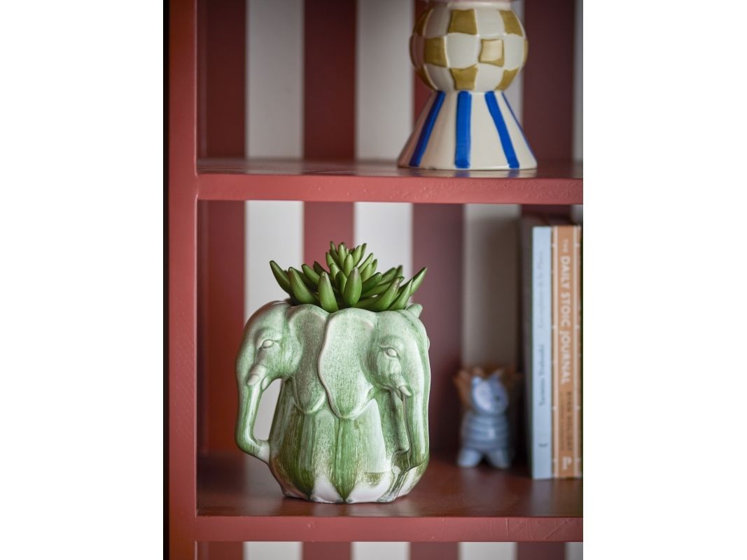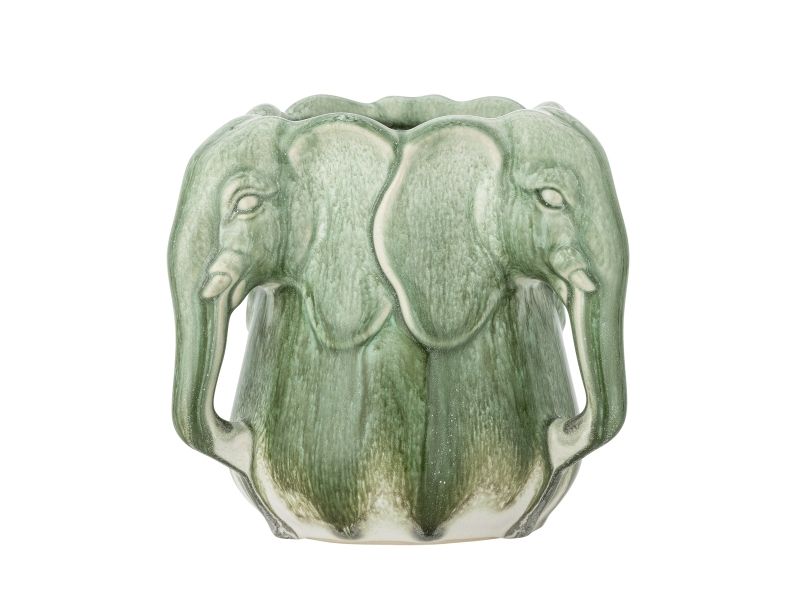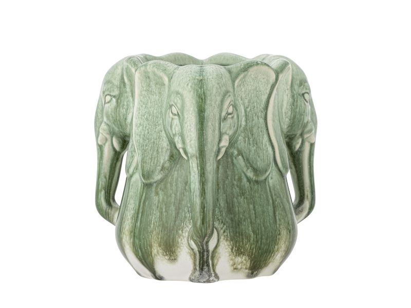 Die Vase Pontus von Bloomingville ist aus Steingut gefertigt und mit Elefantenköpfen verziert, die eine skulpturale und auffällige Form bilden. Die grüne Glasur weist schöne Schattierungen und Oberflächenvariationen auf, die der Vase einen lebendigen und einzigartigen Look verleihen.