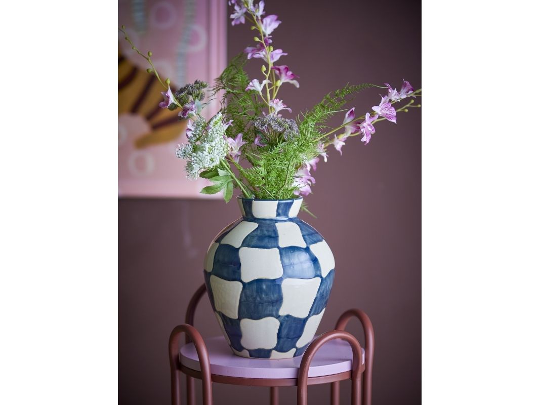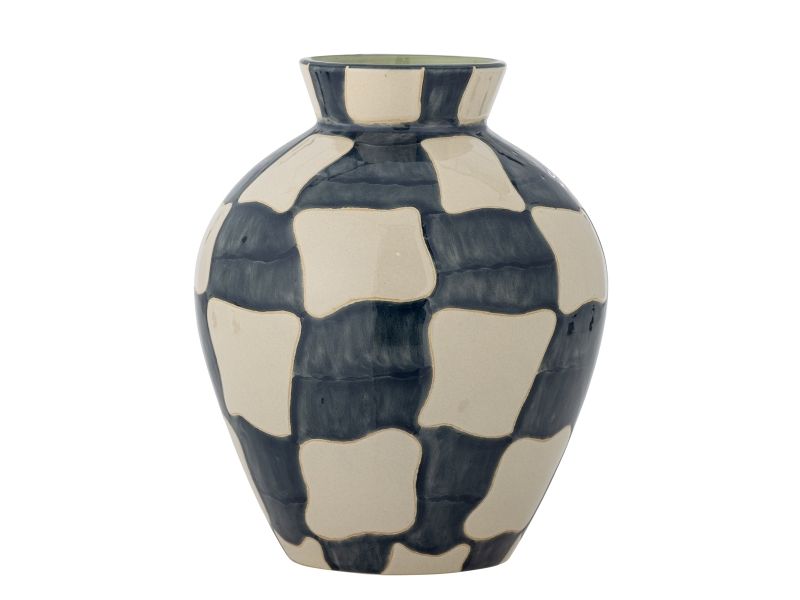Die Check Vase von Bloomingville ist aus Steingut gefertigt und mit einem grafischen Muster in blauen und hellen Tönen handbemalt. Die handgemalte Dekoration sorgt dafür, dass jede Vase ein Unikat mit leichten Abweichungen in Muster und Farbe ist.
