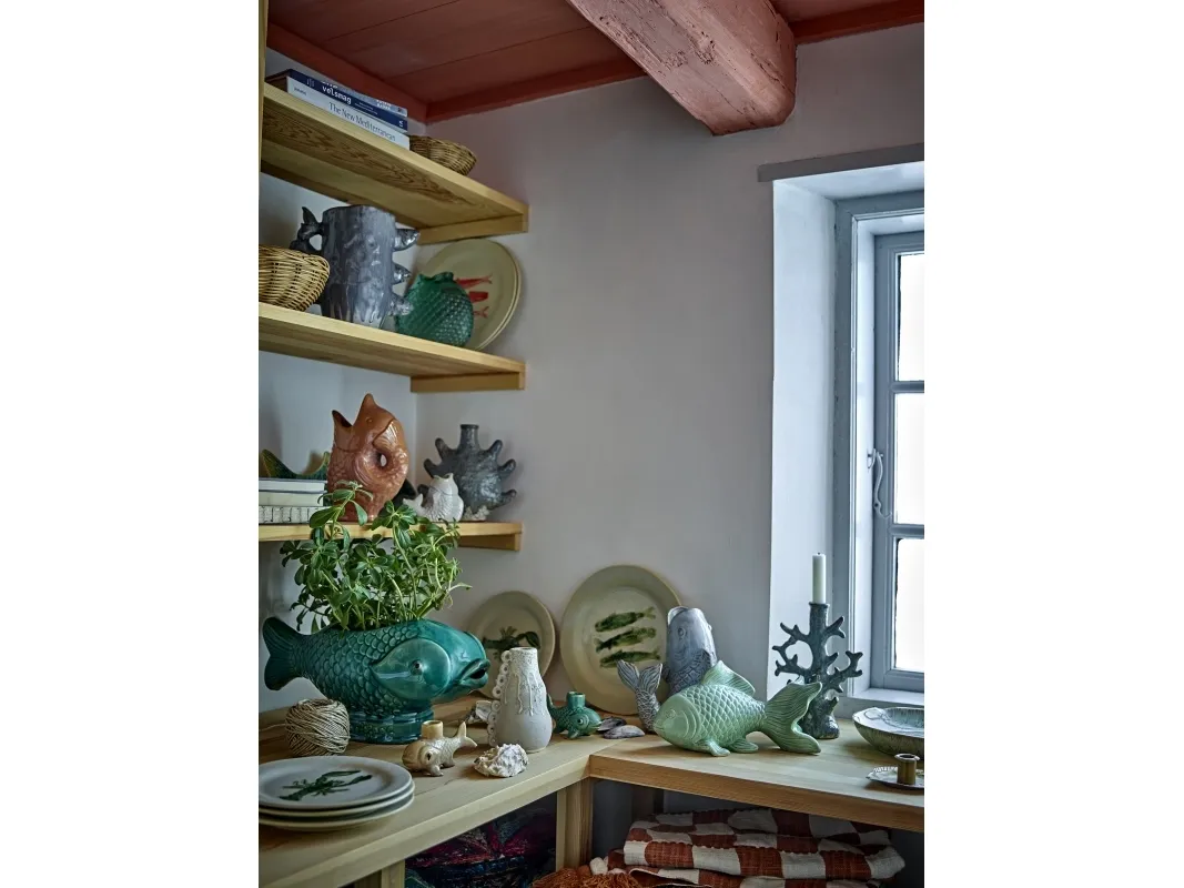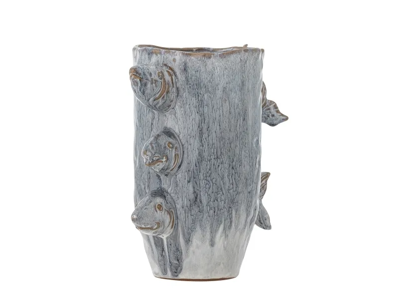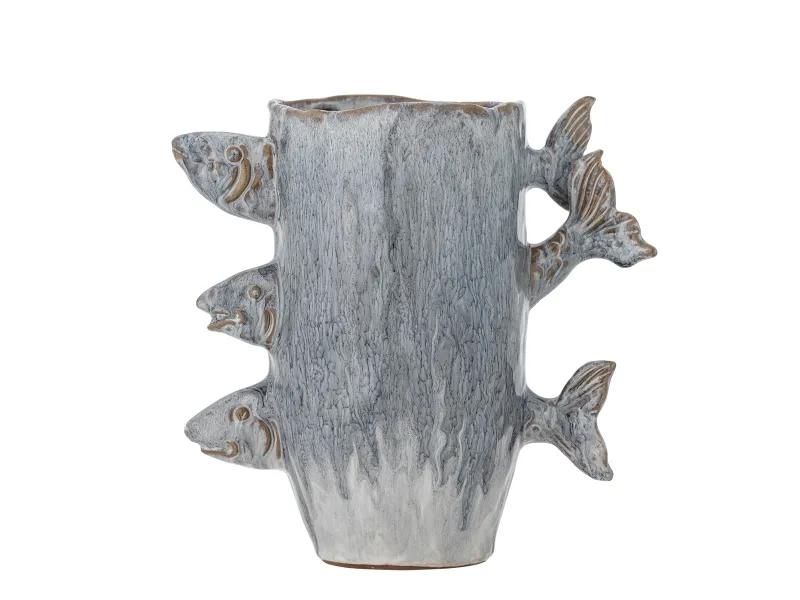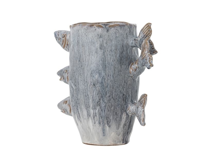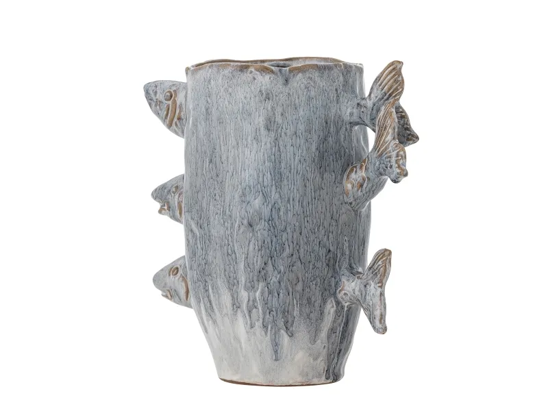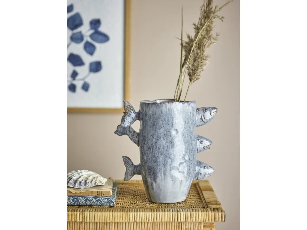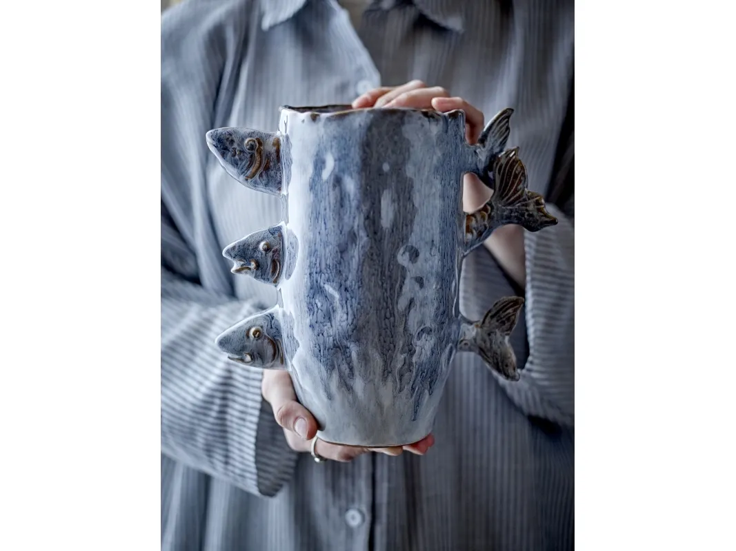 Die Vase Tace von Creative Collection besteht aus Steingut mit drei kleinen Fischen als dekoratives Detail. Die blaue reaktive Glasur verleiht der Vase ein auffälliges Aussehen - jede Vase variiert im Aussehen.