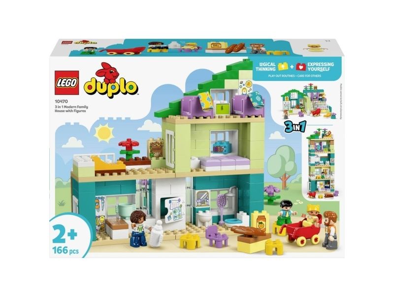 Modernes Familienhaus mit Figuren – 3-in-1-Set (10470) lässt Kleinkinder ab 2 Jahren ein Puppenhaus bauen und das Familienleben fantasievoll nachspielen. Das Spielen mit den 4 Figuren – 2 Eltern, einem Kleinkind und einem Baby – und dem Puppenhaus fördert die soziale und emotionale Entwicklung von Kleinkindern. Das Set bietet viele kreative Möglichkeiten, um die Fingerfertigkeit zu verbessern. Junge Kinder können mit denselben LEGO® DUPLO® Bausteinen 3 verschiedene Varianten des Puppenhauses bauen. Sie können das Modell als Etagenwohnung oder als 2 bzw. 4-stöckiges Puppenhaus mit Dachgarten und Zubehör wie einem Liegestuhl und einem Insektenhotel bauen. Zu dem Puppenhaus gibt es auch jede Menge Zubehör, das Kleinkinder aus dem eigenen Zuhause kennen. Zum Beispiel laden ein Kühlschrank, eine Toilette und ein Kinderwagen zu vielen Rollenspielen ein. Diese Funktionen lassen Kinder unzählige Geschichten darstellen. Beim Spielen entwickeln sie Kreativität und lernen die Abläufe und die verschiedenen Rollen in einer Familie kennen. Das Set besteht aus 166 Teilen.