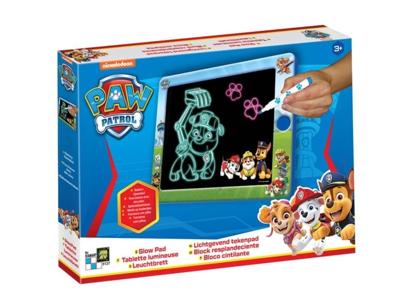 Glow Pad - PAW PATROL The most innovative revolutionary illuminated led light up drawing pad and a night-light for the child room to show his latest creation in the darkness of the child's room. 7 ILLUMINATED POSSIBILITIES & INTERCHANGING COLOURS. Including 2 special markers. 3xAAA Batteries 1.5 Volt Required (Batteries not included) Ages: 3 +