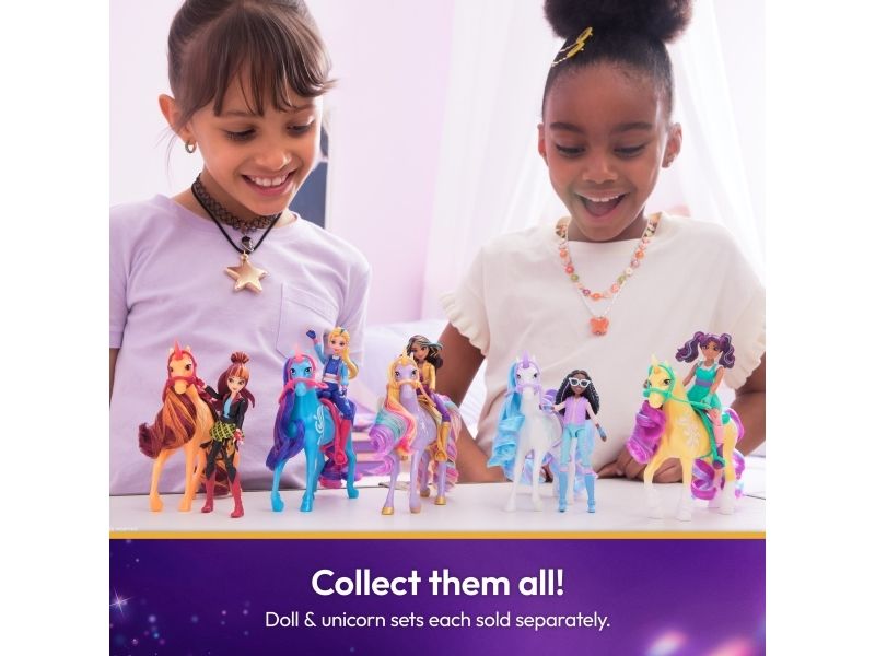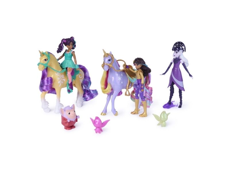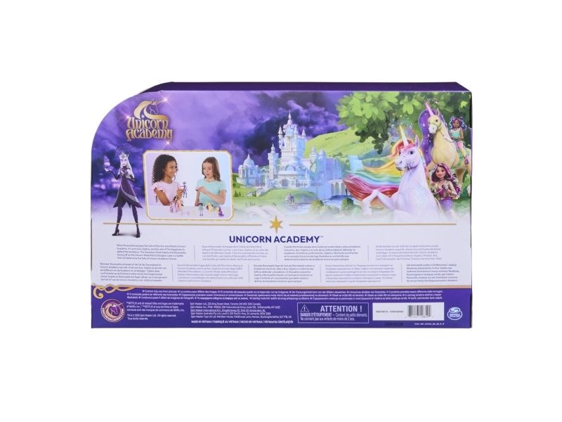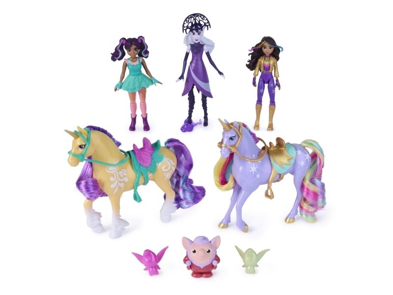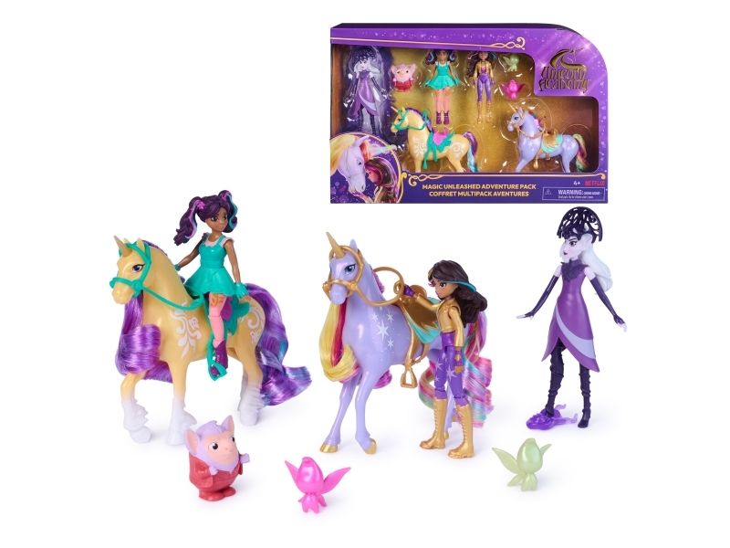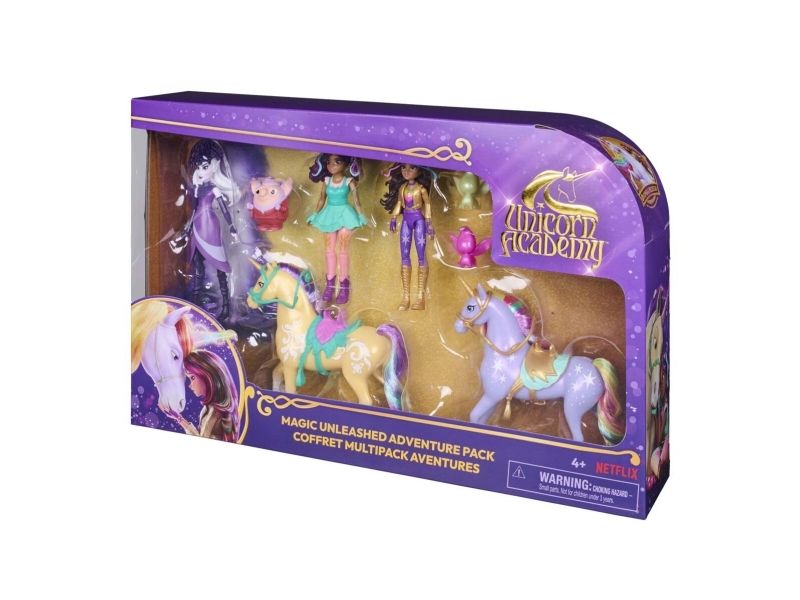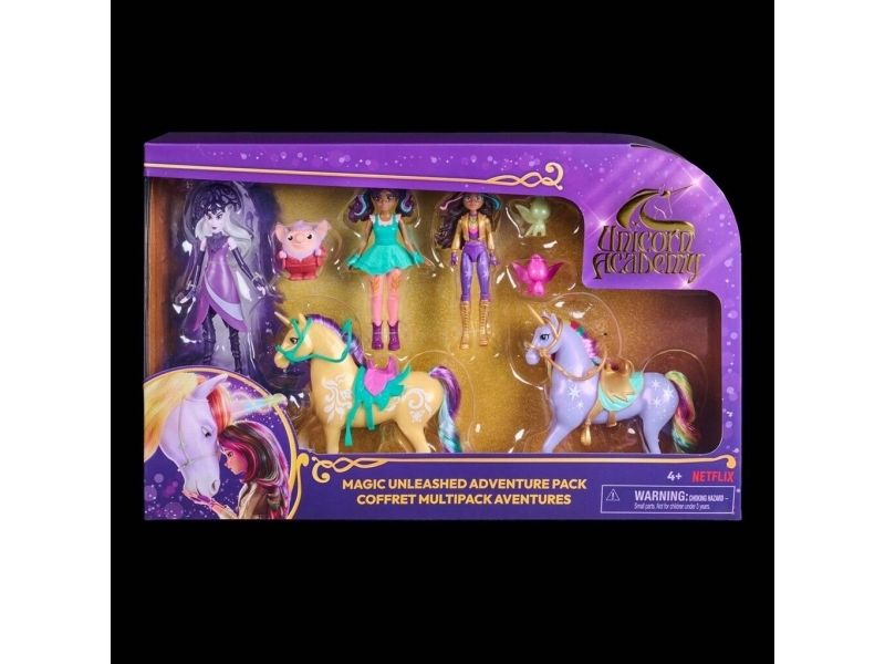 Relive your favourite scenes from Unicorn Academy with the Magic Unleashed Adventure Pack. Inspired by the NETFLIX animated show and best-selling book series where friendship reins, this set will spark endless imaginative storytelling. Inside the box, discover 11,4 cm figures of Sophia and Ava, 12 cm Wildstar and Leaf, plus a 14 cm Ravenzella, Dwerpin figure and 2 Fate Fairies you won’t find anywhere else. With realistic true-to-show details and 7 points of articulation on each doll, pose Sophia and Ava on their unicorns and help defend Unicorn Academy against Ravenzella and Grim Magic. Ravenzella’s neck and arms move, and the Fate Fairies and removable bridles and saddles on each unicorn add to the fun. For more ways to experience Unicorn Academy with your favourite characters, look for the other small dolls and unicorns (toys sold separately) and expand your world. For kids who enjoy unicorns and horse toys, dolls & accessories, doll house play, collectibles, plush toys and more, Unicorn Academy toys are fun birthday gifts for girls or gifts for any occasion. Experience enchanting Unicorn Academy adventures with the Magic Unleashed Adventure Pack.