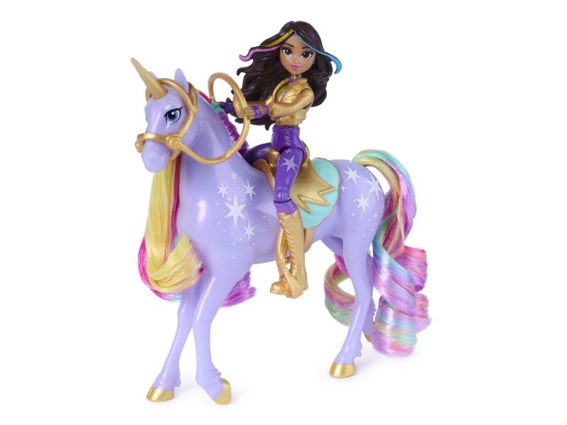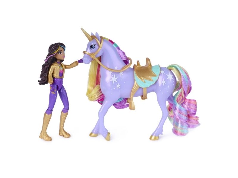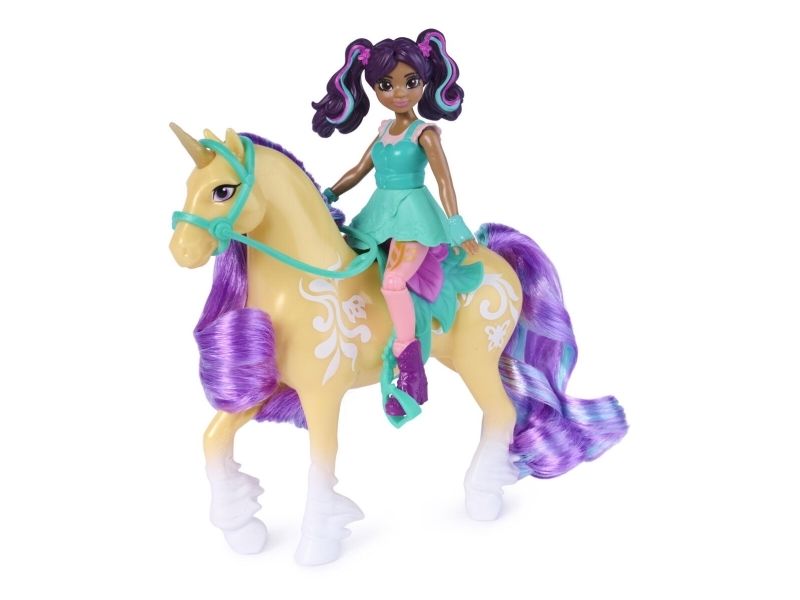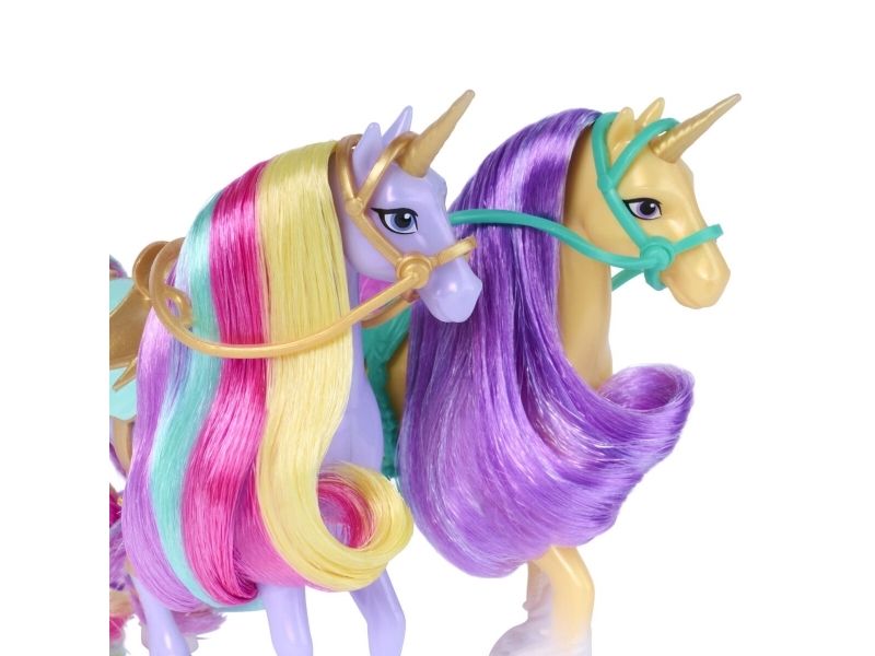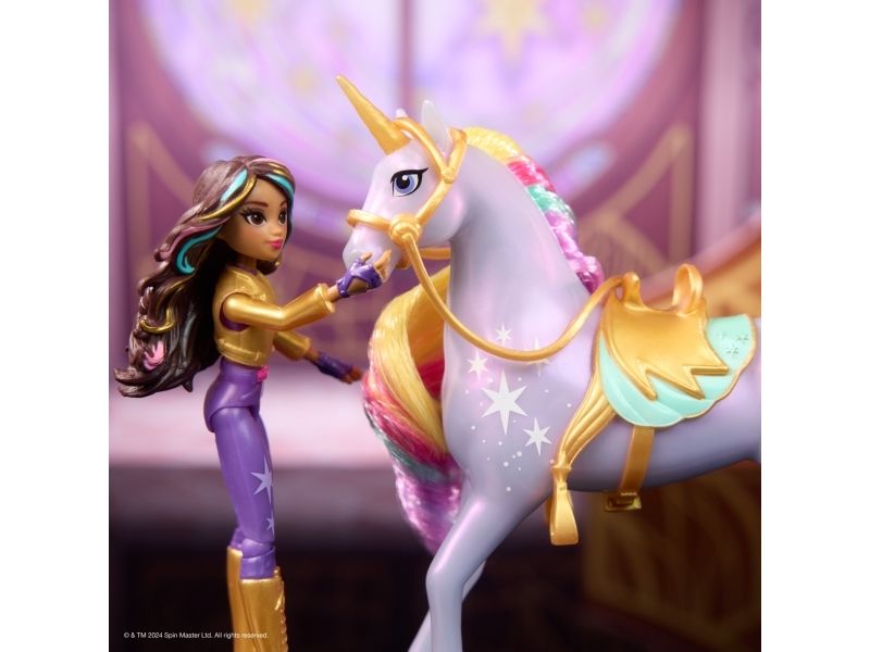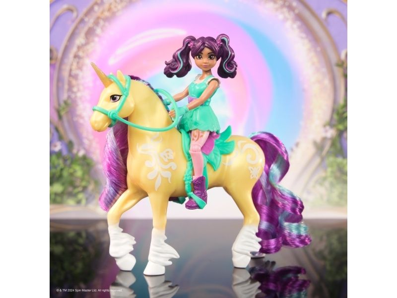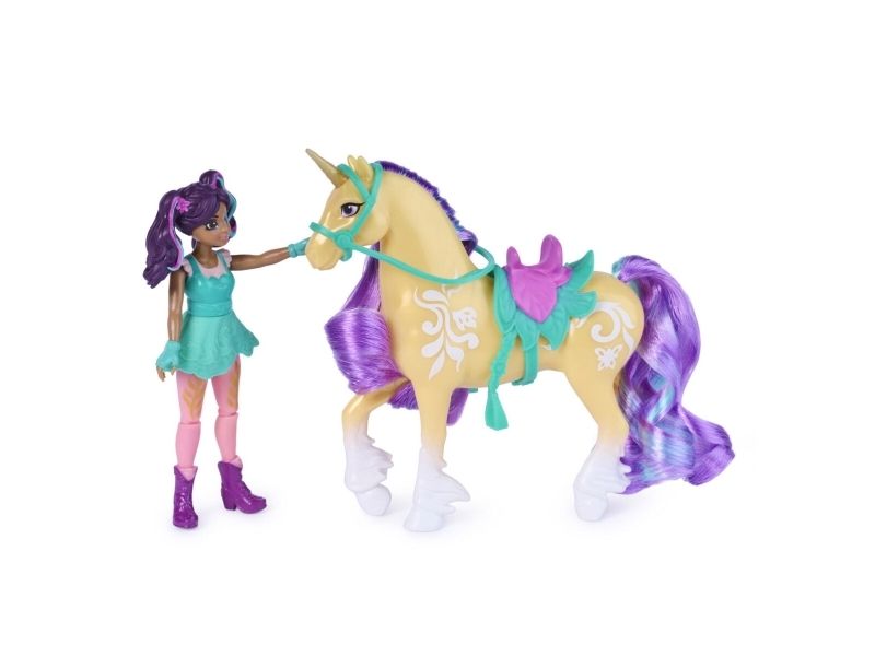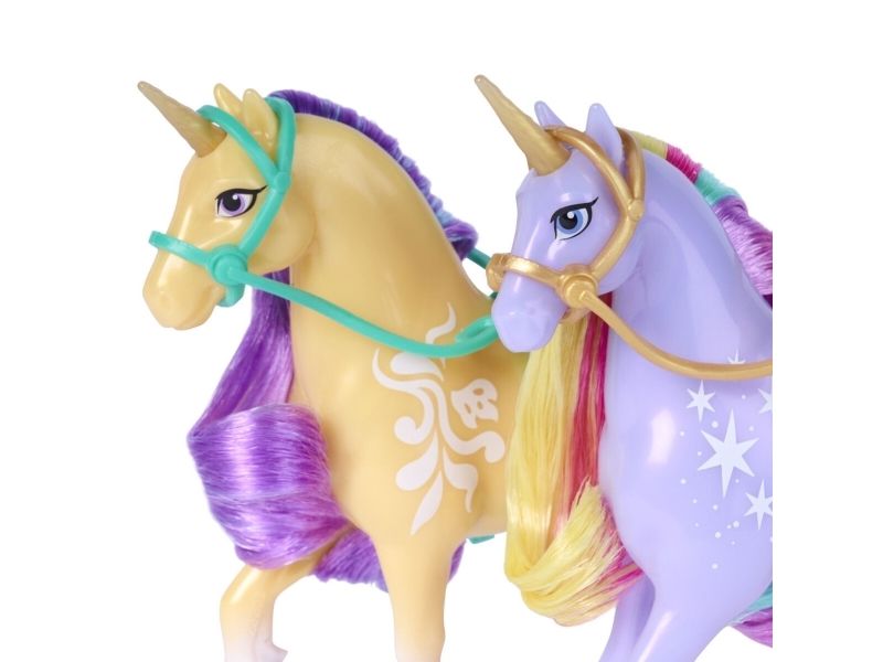Relive your favourite scenes from Unicorn Academy with the Magic Unleashed Adventure Pack. Inspired by the NETFLIX animated show and best-selling book series where friendship reins, this set will spark endless imaginative storytelling. Inside the box, discover 11,4 cm figures of Sophia and Ava, 12 cm Wildstar and Leaf, plus a 14 cm Ravenzella, Dwerpin figure and 2 Fate Fairies you won’t find anywhere else. With realistic true-to-show details and 7 points of articulation on each doll, pose Sophia and Ava on their unicorns and help defend Unicorn Academy against Ravenzella and Grim Magic. Ravenzella’s neck and arms move, and the Fate Fairies and removable bridles and saddles on each unicorn add to the fun. For more ways to experience Unicorn Academy with your favourite characters, look for the other small dolls and unicorns (toys sold separately) and expand your world. For kids who enjoy unicorns and horse toys, dolls & accessories, doll house play, collectibles, plush toys and more, Unicorn Academy toys are fun birthday gifts for girls or gifts for any occasion. Experience enchanting Unicorn Academy adventures with the Magic Unleashed Adventure Pack.