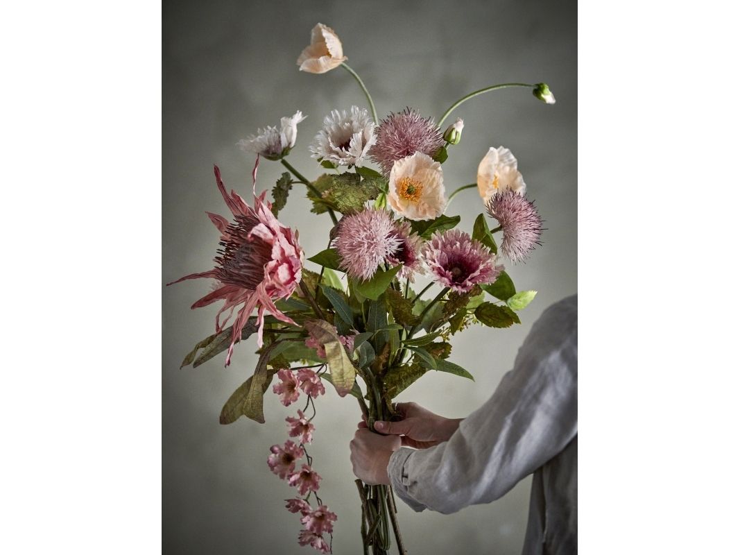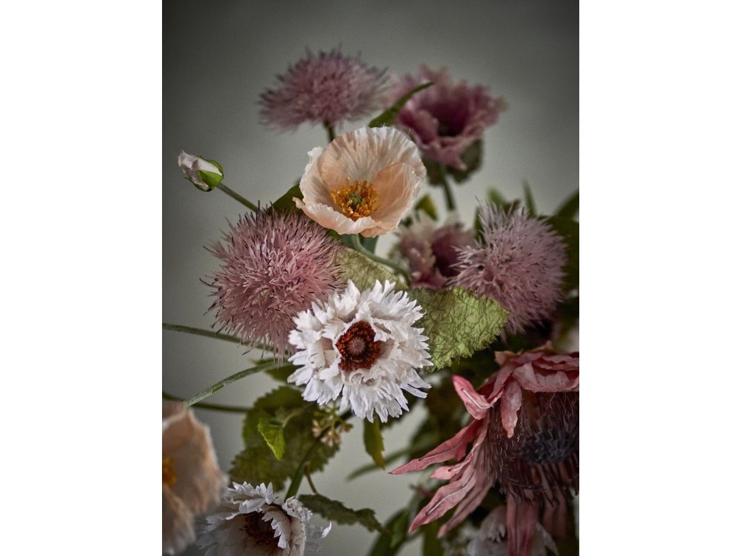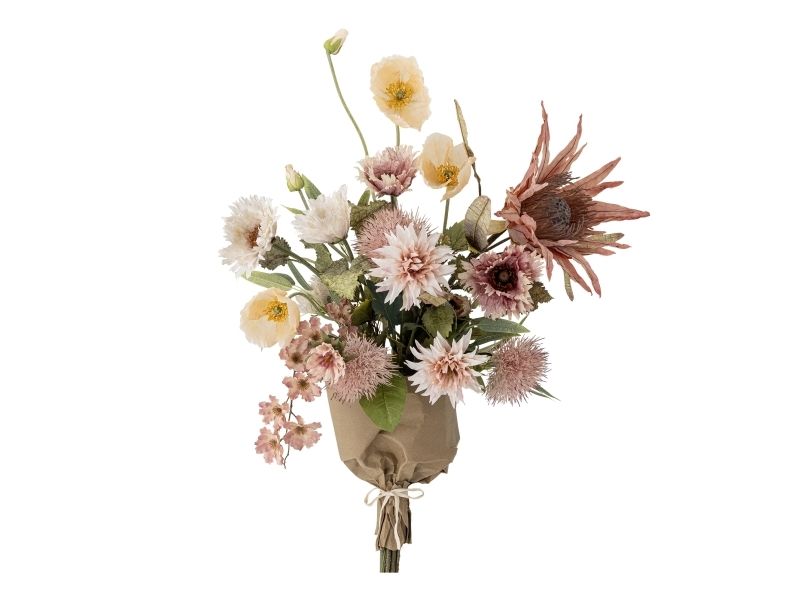 Der Dust Blumenstrauß von Bloomingville ist ein künstlicher Blumenstrauß mit üppigen Blüten in zarten Rosétönen und grünen Blättern. Er ist in Kraftpapier gewickelt und mit einer Schnur gebunden. Nur zur Dekoration, nicht dem Wasser aussetzen.