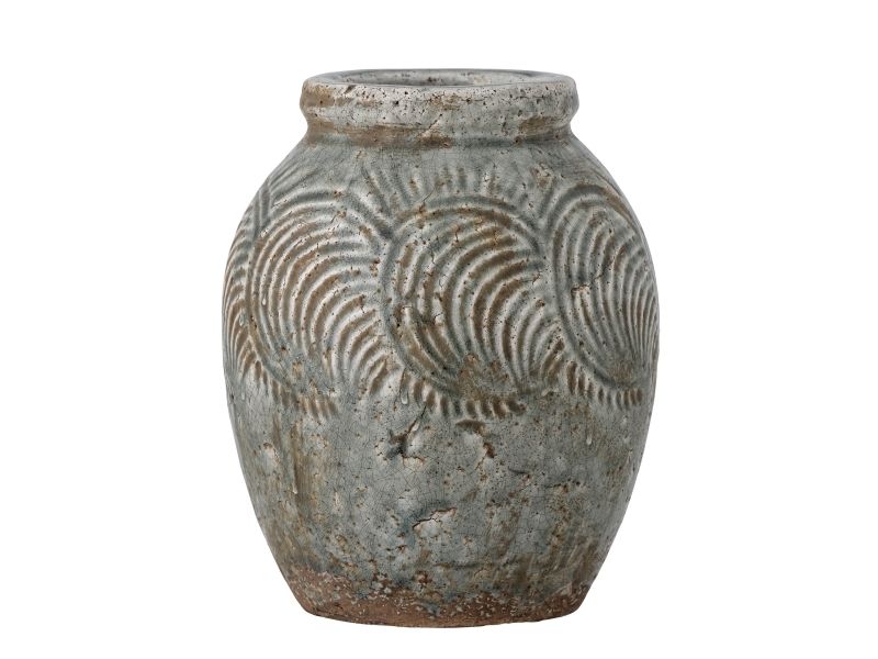 Die Deko-Vase Damian von Bloomingville ist eine rustikale Vase aus Terrakotta. Die Vase hat eine schöne grüne reaktive Glasur und ein graviertes abstraktes Muster. Aufgrund der Natur der Glasur sowie der handgefertigten Technik können Farbvariationen vorkommen. Perfekt für getrocknete Blumen, da sie nicht zu 100 % wasserdicht ist.