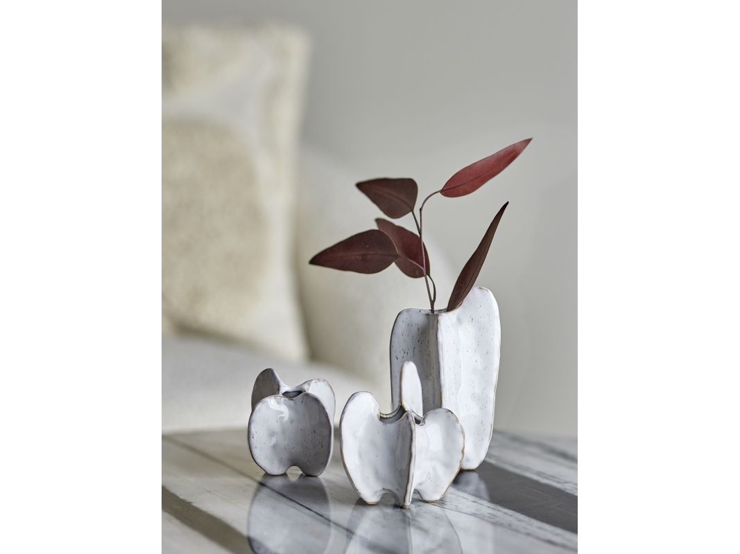 Die Jayce Vase von Bloomingville ist ein skulpturales Set aus drei Vasen aus Steingut. Jede ist mit einer reaktiven Glasur veredelt, die feine Unterschiede in Muster und Farbintensität entstehen lässt – so wird jedes Stück zum Unikat. Mit sanft gerundeten, blütenblattartigen Formen präsentieren sich die Vasen in aufeinander abgestimmten Offwhite-Tönen mit warmen Akzenten.