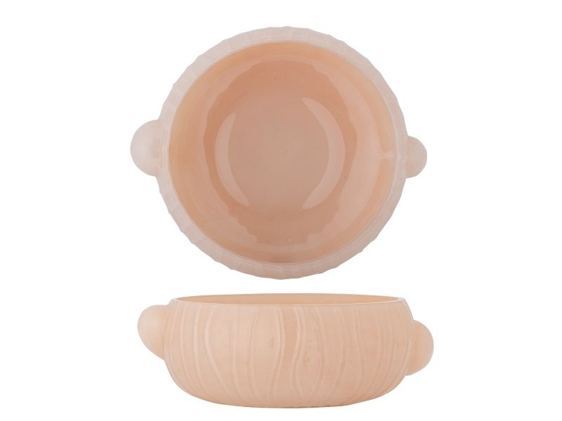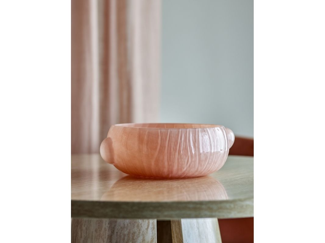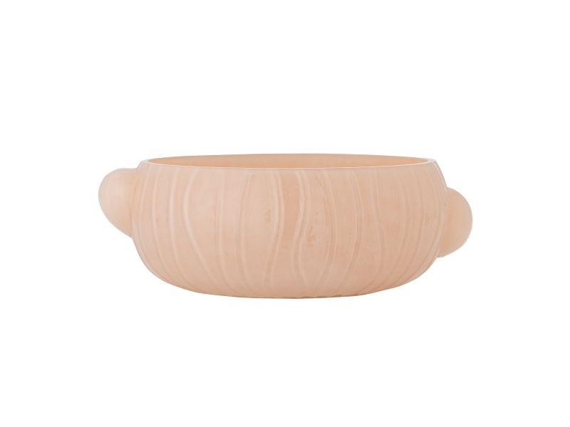 Die Lalie Schale von Bloomingville ist eine Glasschale in zartem Rosaton mit runder Form, leicht gerippter Oberfläche und dezenten seitlichen Griffen. Durch Handarbeit können kleine Abweichungen im Muster und in der Farbintensität auftreten – jedes Stück ist dadurch ein Unikat.