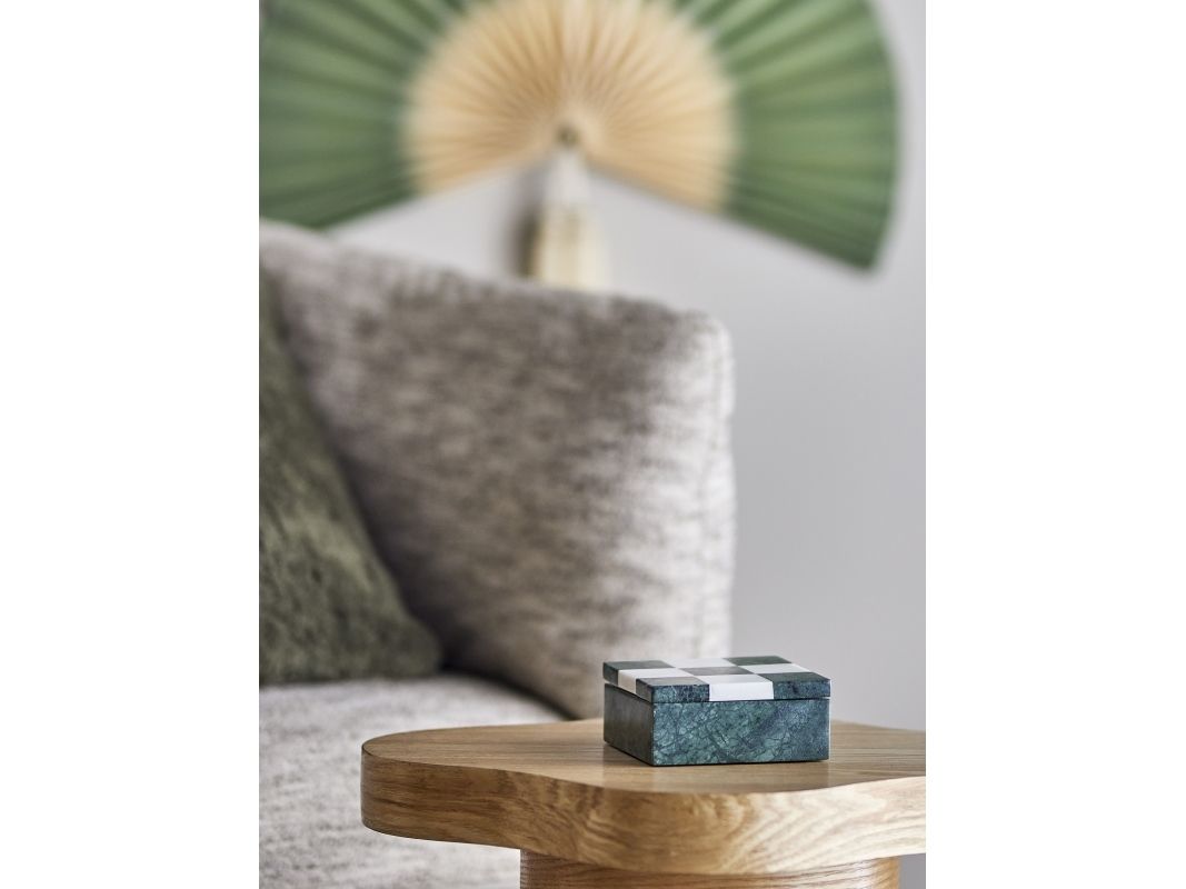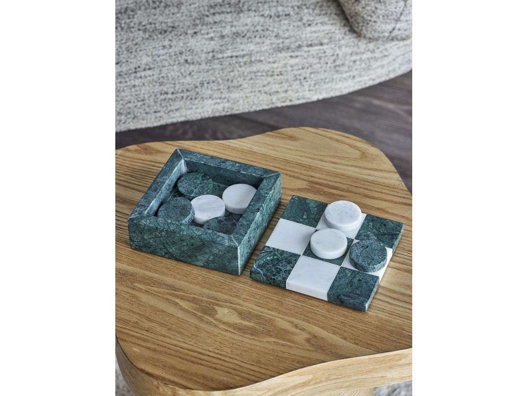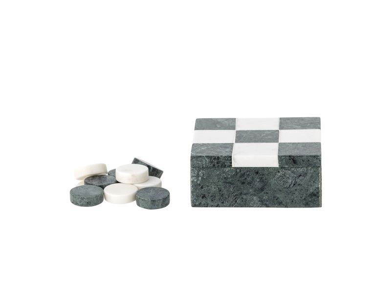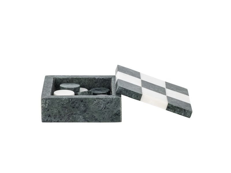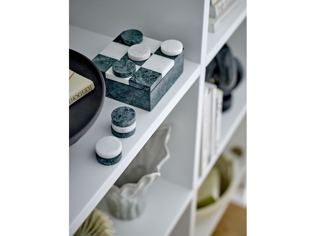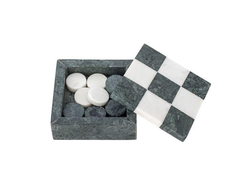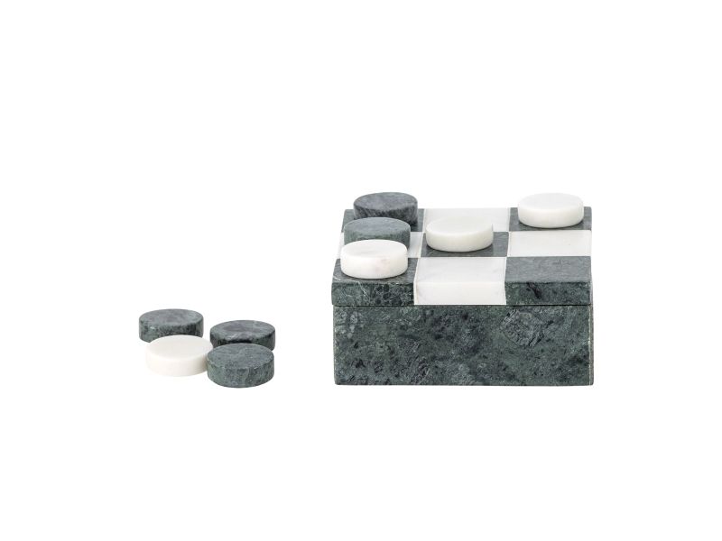 Das Aske Drei gewinnt von Bloomingville ist ein dekoratives Spiel aus poliertem Marmor mit einem fein weiß‑grün karierten Deckel. Die runden Spielsteine sind im Inneren der Box verstaut. Da es sich um Naturmaterial handelt, kann es zu Farbabweichungen kommen – jedes Stück ist ein Unikat.
