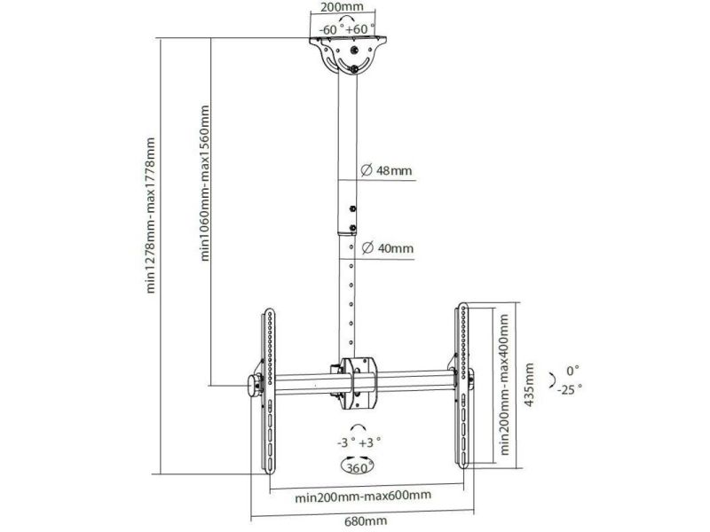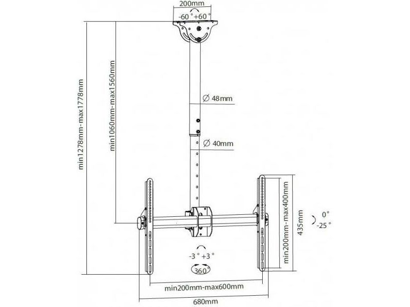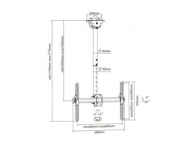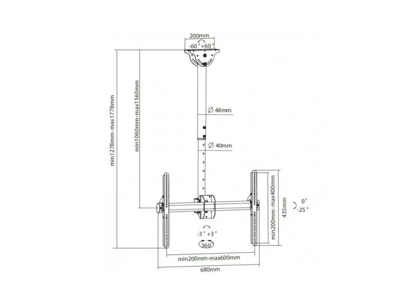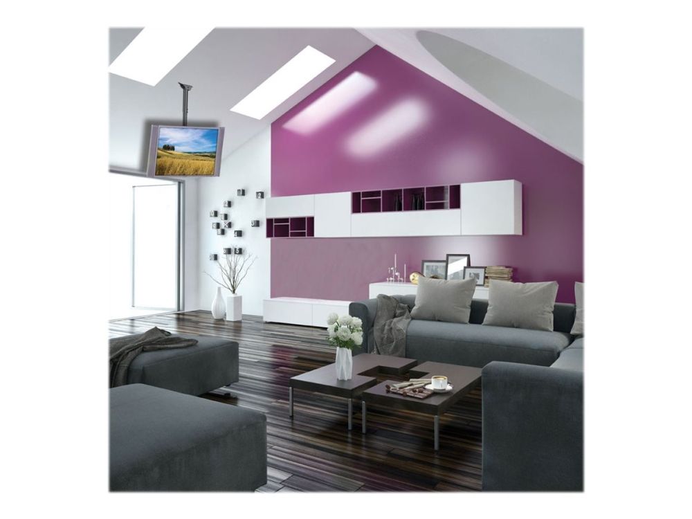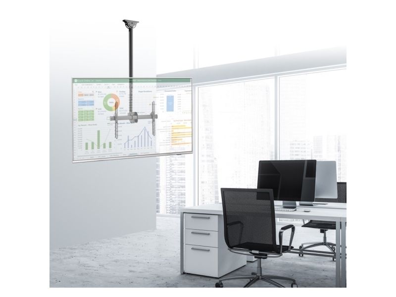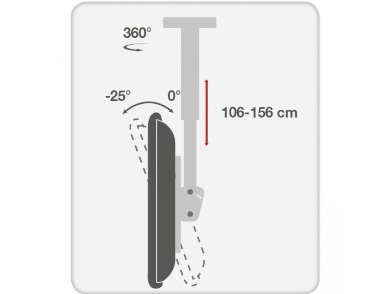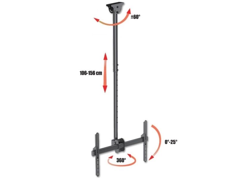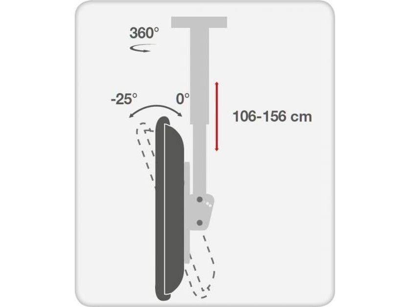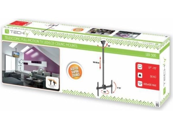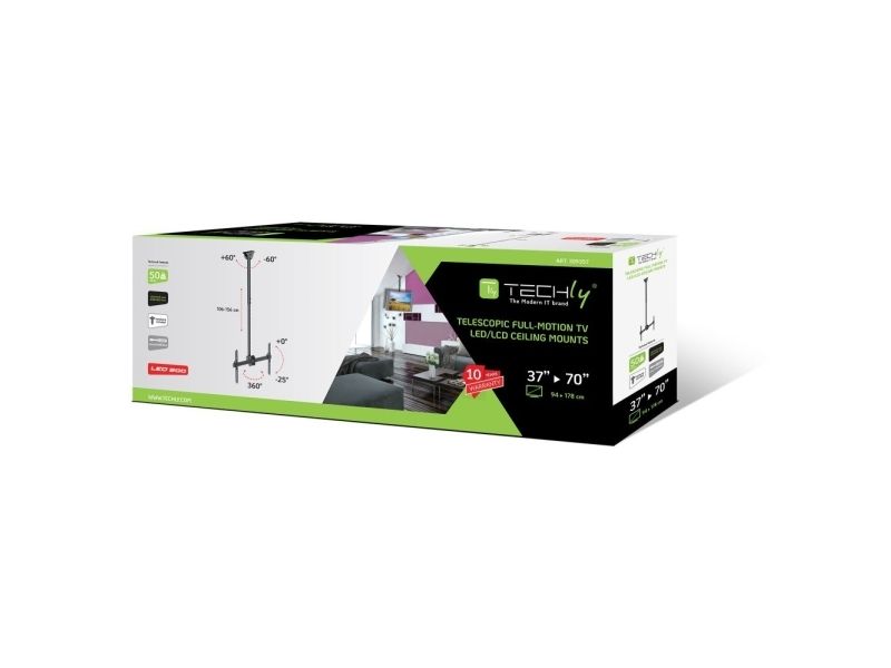 - ICA CPLB-946L is a telescopic bracket ceiling full-motion designed to offer the ultimate in versatility and universal compatibility - Tilting plate for ceiling applications and sloping floor - It allows screens to be tilted down or rotated without tools - Includes VESA plate for any LCD TV 37 "- 70" or monitors up to 50 kg - Adjustable height for perfect TV placement - A flume cable management keeps cables concealed and organized - Maximum length of the arm: 1778 mm