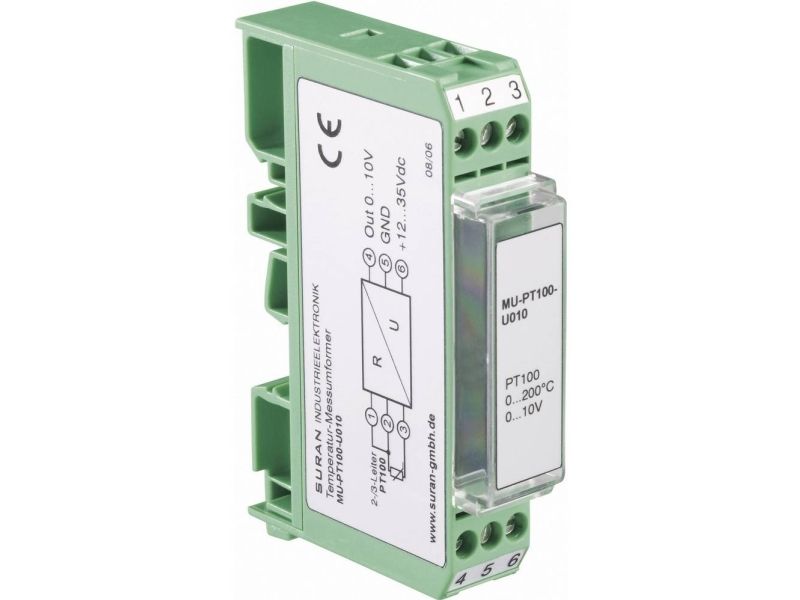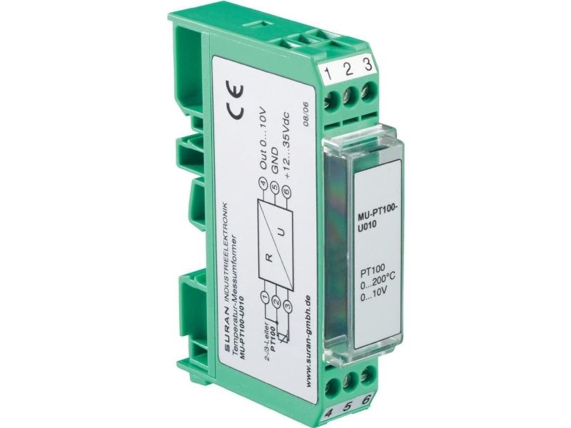 Temperaturmessumformer für Pt 100Anschlussart 2- oder 3-Leiterschaltung - EMG-Gehäuse - Verpolungsschutz - Eingang Pt 100 (DIN 60751) 2-/3-Leiter. Analoger Pt 100-Temperaturmessumformer mit linearisiertem Ausgang zur Montage auf Normbecherschienen.