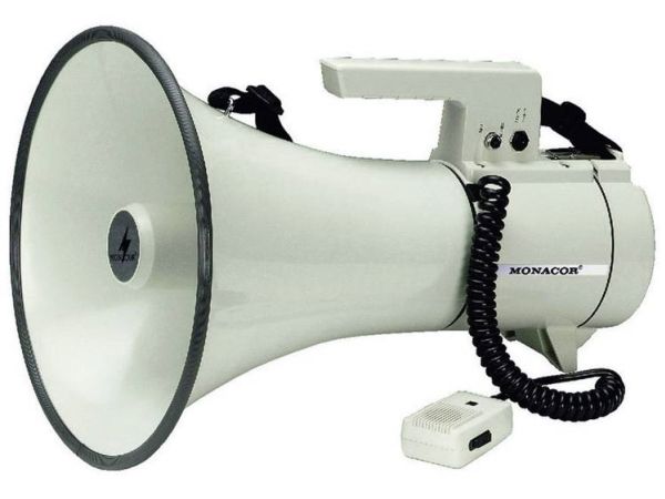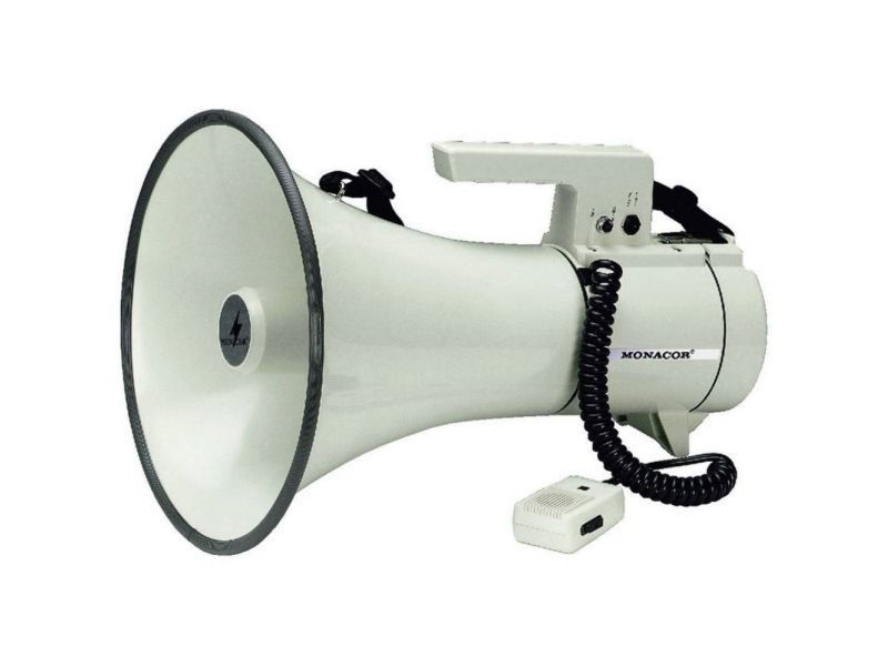 Attention guaranteed!;With our range of reliable megaphones, we provide the perfect solution for each application. A few basic selection criteria will help you to choose the right unit. The operating range surely is the most important one. Here, the following applies: with increasing sound pressure (in dB), the operating range of the megaphone increases, too. Furthermore, it is possible to choose between megaphones with integrated microphone, with hand-held microphone or units with an additional wireless microphone. Each megaphone from MONACOR is supplied with power by standard batteries. As an alternative, a few units also feature a 12 V connection. Size, weight and power supply are further selection criteria for choosing the right megaphone. With these comparison criteria, you will surely find the ideal megaphone meeting your individual requirements very quickly.;Megaphone;#Hand-held microphone with helix cable;#Lockable talk button and volume control at the microphone;#Jack for external 12 V battery operation;#Siren, switchable;#Connection cable for motor vehicles;#8 mm threaded bushing for mounting onto a stand;;Manufacturer information:;MONACOR INTERNATIONAL GmbH & Co. KG Konsul-Smidt-Str. 68 28217 Bremen Germany [email protected];Safety Notes and Warning Messages;Never operate the megaphone close to anybody?s ears; the amplified voice or feedback noise may cause hearing damage. The unit is suitable for indoor use only. Protect it against dripping water and splash water, high air humidity and heat (admissible ambient temperature range: 0 - 40 °C). Remove the rechargeable batteries or batteries if the device is not in use for a longer period of time (e.g. more than a week). This avoids possible damage through leaking batteries. If the unit is to be put out of operation permanently, take it to a local recycling plant for a disposal which is not harmful to the environment. Batteries and rechargeable batteries must not be disposed of with household waste. They must be disposed of in accordance with local regulations for hazardous waste.