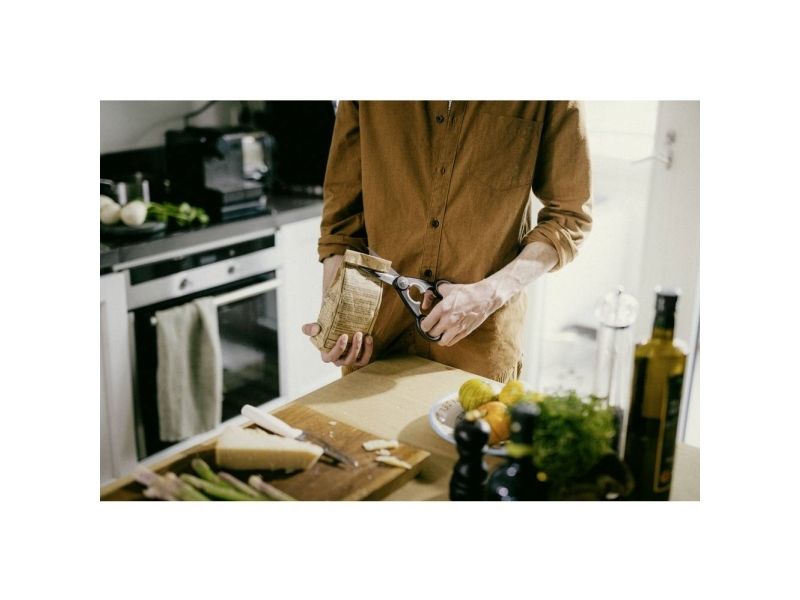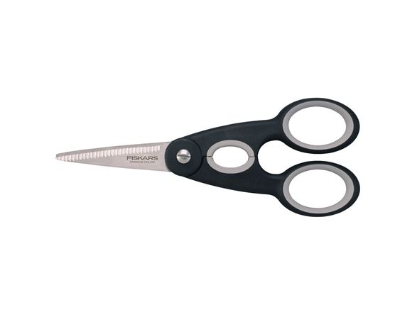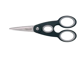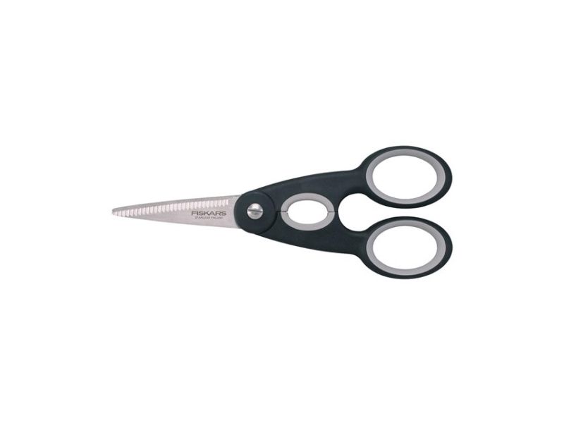 Fiskars Functional Form Küchenschere: Funktionaler Alleskönner in zeitgemäßem Look. Funktional, kräftig und zeitgemäß präsentiert sich die 22 cm lange und 99 g leichte Küchenschere aus der Functional Form Serie von Fiskars. Ihre breiten, starken Klingen aus rostfreiem Stahl mit einer Härte von HRC 57 schneiden mühelos durch Papier und Pappe, aber auch durch Kunststoff, Verpackungen und viele weitere Materialien in Küche und Haushalt. Die gezahnte untere Klinge fixiert das Schneidgut und erleichtert zusammen mit der einstellbaren Klingenspannung - das Schneiden. Perfekten Halt bieten dabei die weichen Softouch®-Griffe, die mit ihrer rutschfesten Oberfläche für ein Mehr an Sicherheit sorgen. Die ovale Aussparung zwischen den Griffen dient nicht allein der Optik - mit ihrer Hilfe lassen sich festsitzende Drehverschlüsse (z.B. von Wasserflaschen) problemlos öffnen. Für Rechts- und Linkshänder