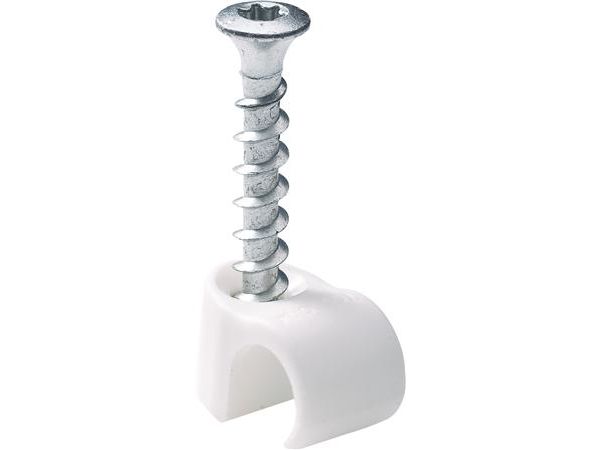 Schraubschelle TCS®-X-C3 mit T20-Kopf Kunststoffschelle mit Schraube für Wand- und Deckenmontage im Innen- und Außenbereich, mit oder ohne Dübel. Schraube mit Oberflächenbehandlung nach Korrosionsklasse C3 und Kreuzschliff T20. Für Rundkabel. Material: PP/Stahl.