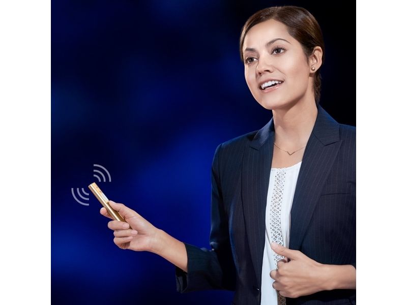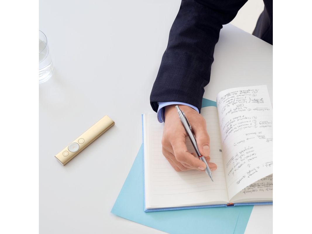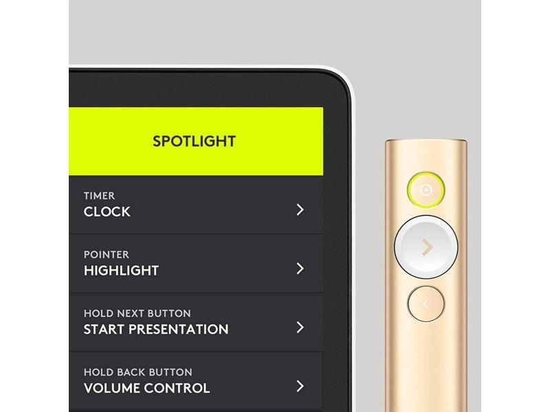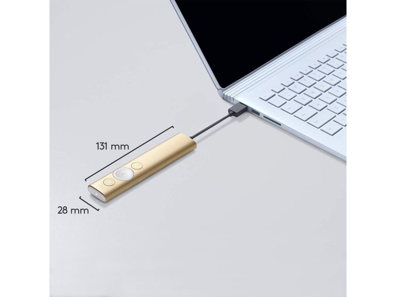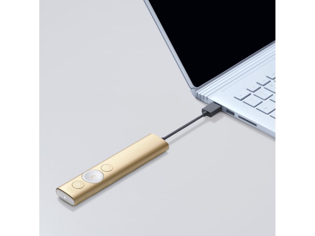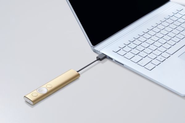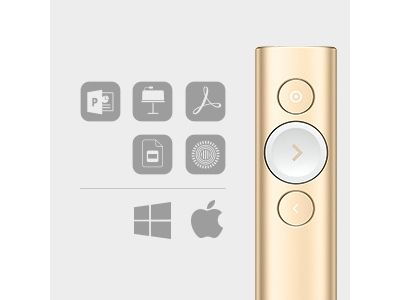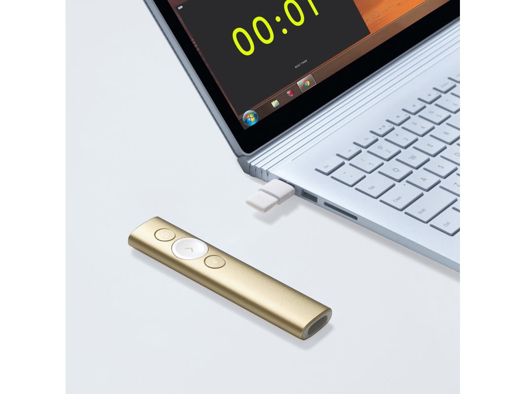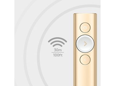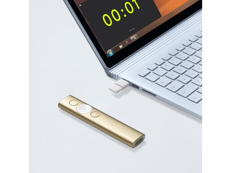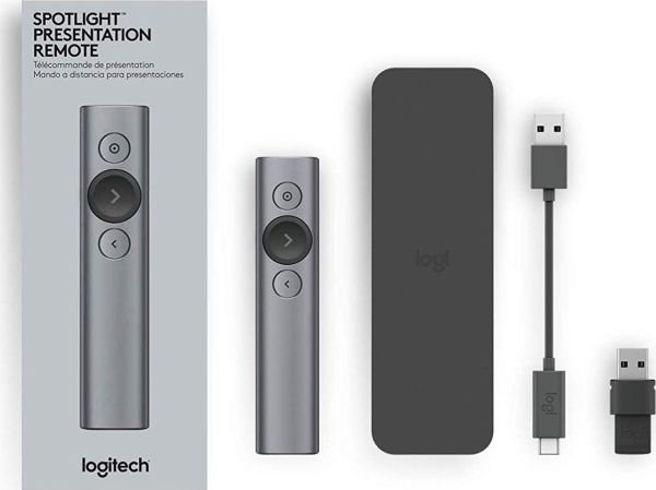 Logitech Spotlight sets a whole new standard in presentation control, allowing for simple slide navigation and interaction with on-screen content from up to 30 meters (100 feet) away.2 The customizable timer sends haptic notifications directly to the user’s hand – and the advanced pointer system allows the user to spotlight and magnify areas of focus in pixel-perfect detail.1 Use the on-screen cursor to play and pause videos, open links, and enjoy a range of rich content interaction. A full charge lasts up to three months2, and Spotlight is plug-and-play on most devices and platforms running popular presentation software.