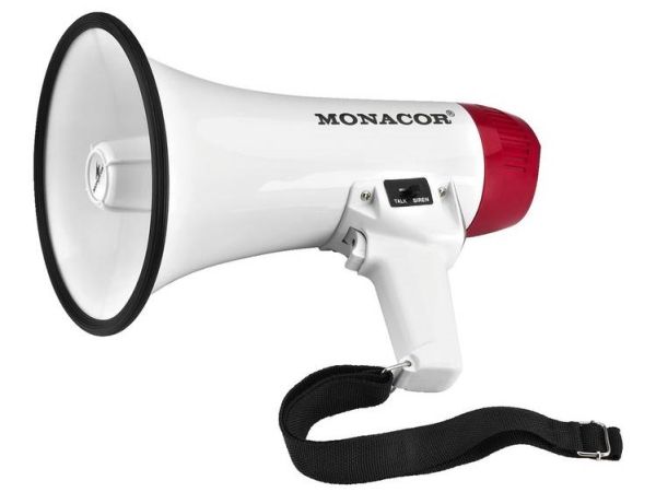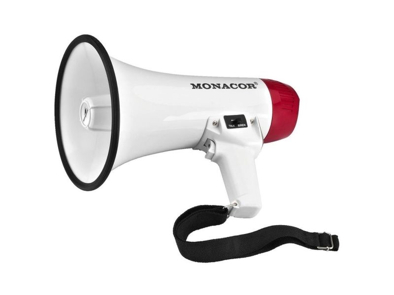 Attention guaranteed! With our range of reliable megaphones, we provide the perfect solution for each application. A few basic selection criteria will help you to choose the right unit. The operating range is surely the most important one. Here, the following applies: with increasing sound pressure (in dB), the operating range of the megaphone increases, too. Furthermore, it is possible to choose between megaphones with integrated microphone, with hand-held microphone or units with an additional wireless microphone. Each megaphone from MONACOR is supplied with power by standard batteries. As an alternative, a few units also feature a 12 V connection. Size, weight and the power supply are further selection criteria for choosing the right megaphone. With these comparison criteria, you will surely find the ideal megaphone meeting your individual requirements very quickly.