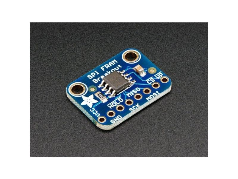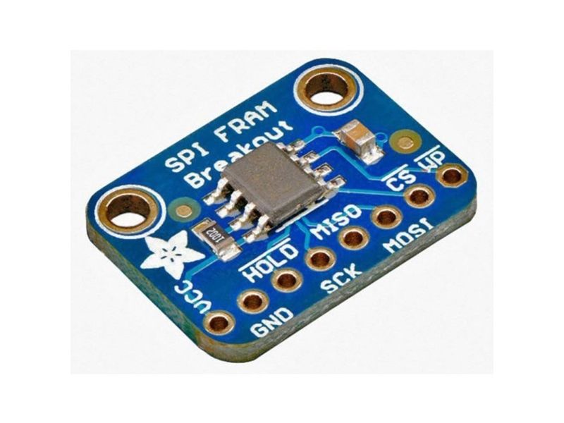 64 kbit / 8 kByte ikke-flygtig SPI-FRAM-hukommelse med breakoutFRAM-hukommelse (FRAM) ligner dynamisk RAM-hukommelse meget, men kun med et ferroelektrisk lag i stedet for et dielektrisk. SPI-FRAM-breakout-Board egner sig fremragende til laveffektanvendelser eller programmer med ikke-konstant spændingsforsyning og data logge eller data buffere. Specielt denne FRAM-chip har 8 kByte-hukommelse og en SPI-interface med en taktfrekvens på op til 20 MHz. Som ved SRAM kan hver byte umiddelbart læses og skrives med 10 billioner, men holder hukommelsen i 95 år ved stuetemperatur. Denne chip kan drives med 3 V eller 5 V forsyningsspænding og logikspænding. Hukommelsen er udført i Stikbræt-venlig med en 2,54 mm raster til pålodning af en stiftliste.