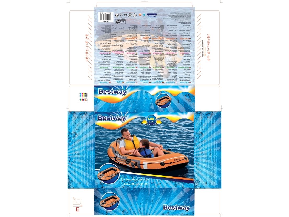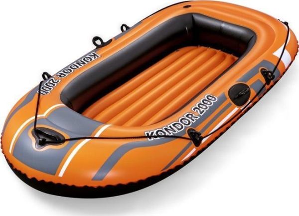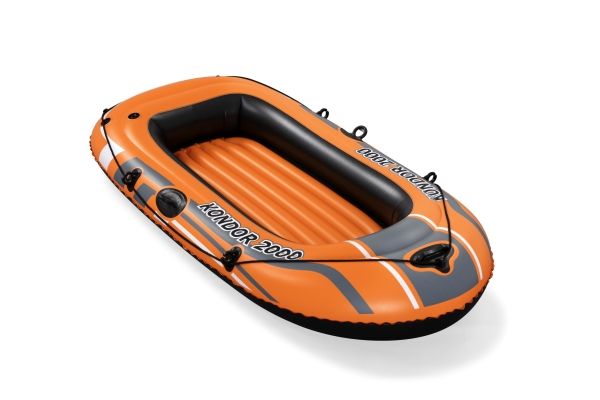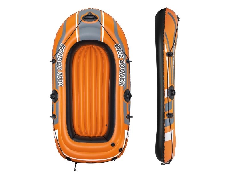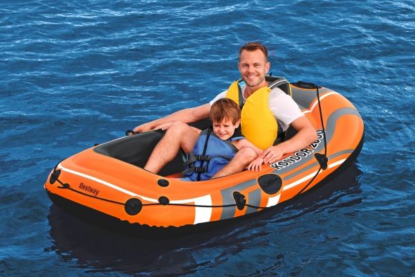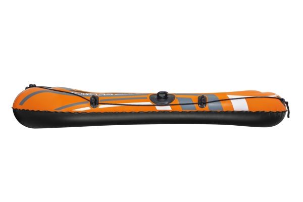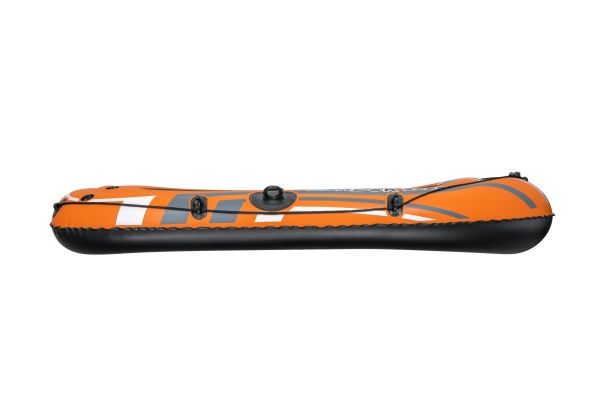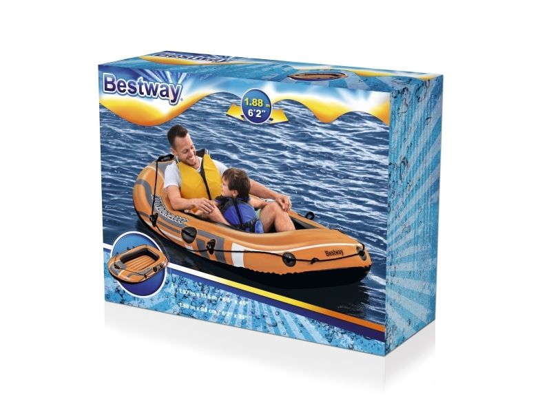 HYDRO-FORCE RAFT - Deflated Size: 1.97m x 1.15m 77” x 45”) - Inflated Size: 1.88m x 98cm 74” x 39”) - Quick inflation/deflation screw valves - Safety valve - Sturdy pre-tested vinyl - 3 air chambers construction - All around grab rope with built-in grommets - Inflatable floor for extra comfort - Heavy-duty handle - Sturdy oarlocks - Oar clasps - Tow ring - Heavy-duty repair patch included Content: One boat, repair patch